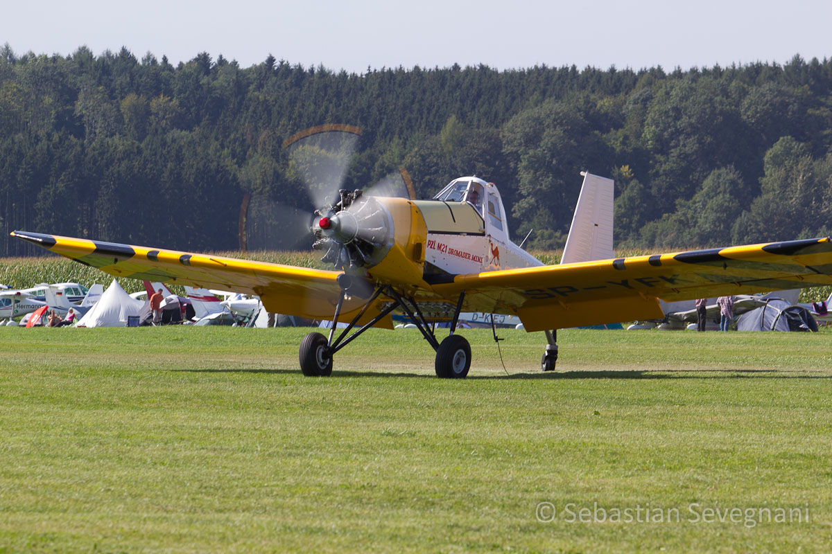 Auf diesem Bild die einzige flugfähige PZL M-21 Dromader Mini in Deutschland mit der Kennung SP-YFK. Bei Tannkosh wurde einducksvoll demonstriert, wieviel "Löschwasser" in diesen kleinen Flieger passt. |