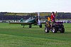 Auf diesem Bild ist die dunkelgrüne Travel Air aus dem Jahr 1929 zu erkennen, wie sie gerade von einem Follow Me zu ihrem Parkplatz geleitet wird. Die Maschine wurde bereits von der amerikanischen Stuntpilotin Florence Barnes geflogen. |