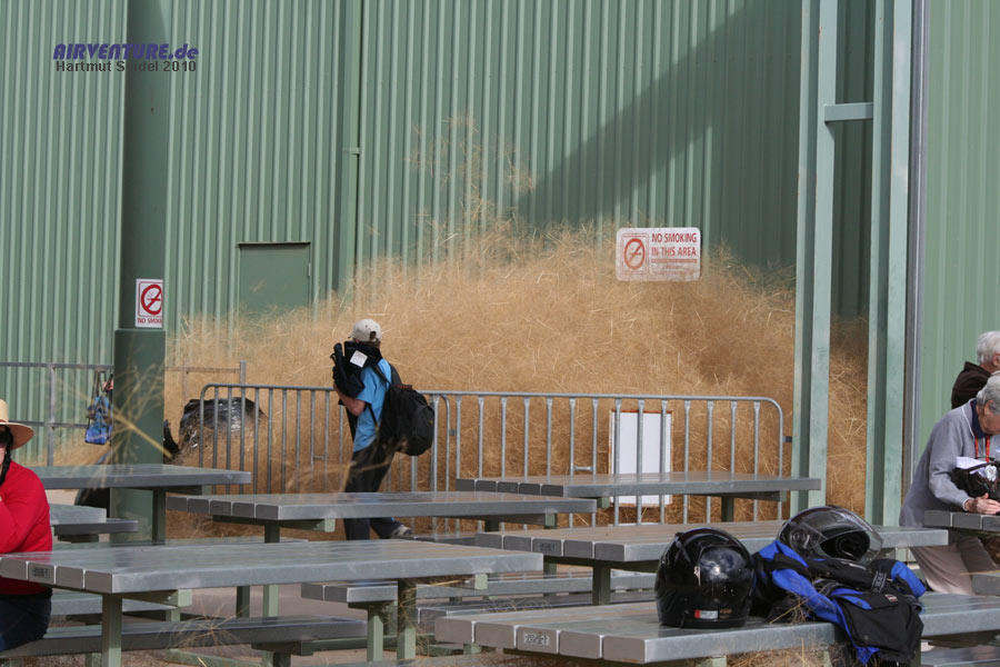 In fernen Kontinenten wird man als Airshowbesucher manchmal mit ganz anderen Naturphänomenen als in Europa konfrontiert, die den Genuss einer Flugveranstaltung etwas schwierig machen können. Wie schon erwähnt, war am Wochenende der Temora Aviation Museum Flying Days im April 2010 das Wetter ziemlich schlecht. Am Sonntag kam schließlich auch noch starker Wind auf, welcher große Mengen von "Hairy Panic" herangeweht hat. Hinter dieser burschikosen Bezeichnung verbergen sich ungeheure Mengen von kleinen Grasbüscheln, die zwar einerseits das Flugprogramm glücklicherweise nicht beeinträchtigt haben. So konnte also diese North American T-28 Trojan problemlos durch die Hairy Panic Grasbüschel zum Start rollen..... |