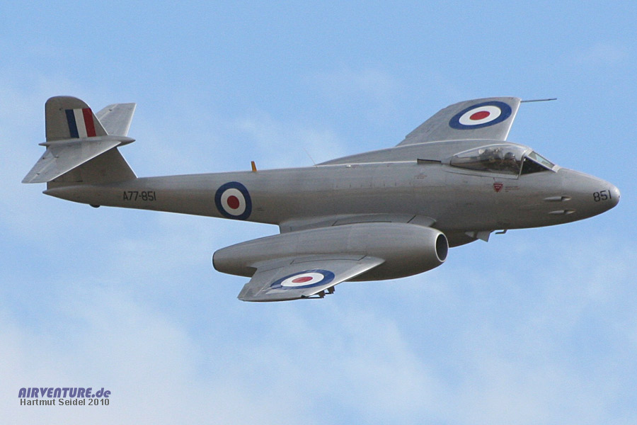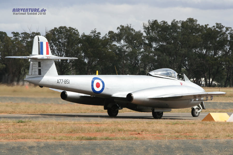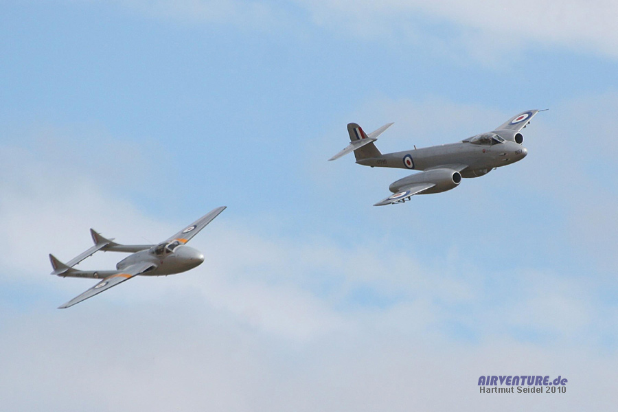 Während der Flying Days im April 2010 wurde die Gloster Meteor F 8 auch in einem interessanten Jet-Formationsflug zusammen mit der De Havilland Vampire aus der Flotte des Temora Aviation Museum gezeigt.