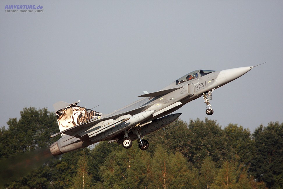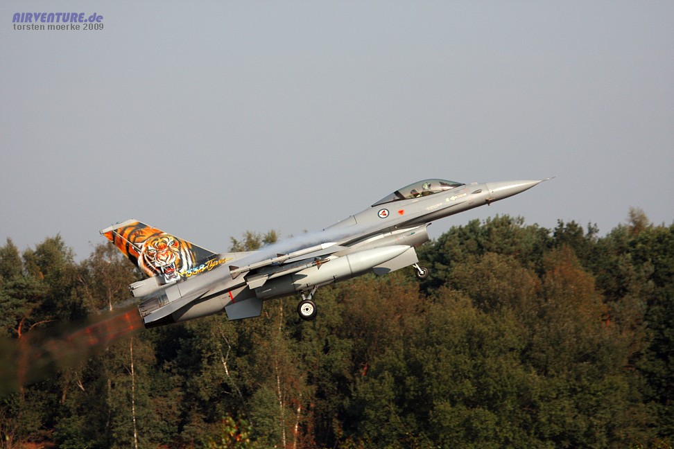 Tiger Meet 2009, Kleine Brogel, Belgien - von Torsten Mörke - Bereits seit 1961 treffen sich die Luftstreitkräfte der NATO Staaten regelmäßig zum "Tiger Meet", der wohl bekanntesten NATO Übung überhaupt. Lediglich in den Jahren 1987, 1999 und 2000 konnte das Treffen nicht stattfinden. Der Luftwaffenstützpunkt "Kleine Brogel" in Belgien ist von Anfang an dabei und zählt zu den regelmäßigsten Veranstaltungsorten. Zum siebten Mal fand 2009 das Tiger Meet in Belgien statt. Mehrere Tage lang werden durch die teilnehmenden Luftstreitkräfte gemeinsame Übungen geflogen, um Zusammenhalt und Kooperation der Teilnehmer auszubauen und länderübergreifende Erfahrungen zu sammeln. Highlight eines jeden Tiger Meet ist schließlich der so genannte "Spotter Day", an dem die Zivilbevölkerung dem Treffen beiwohnen darf. Hierfür ist allerdings eine vorherige Anmeldung inklusive Überprüfung der Personalien erforderlich. Trotzdem entsprechen die Zustände vor Ort ehr denen einer Flugshow, als einer offiziellen NATO Übung. Selbst für die Verpflegung der Massen wurde ausreichend gesorgt. Die Organisation war übrigens generell rundum gelungen, hier kann man den Belgiern nur gratulieren. Selbst das Wetter war wie bestellt... sonnig, warm und mit perfektem Licht zum Fotografieren. Zwar gibt es beim Tiger Meet traditionell keine fliegenden Oldtimer zu sehen, dafür kommen Fans des Jetsounds jedoch voll auf Ihre Kosten. Nirgends kommt man näher an das Geschehen heran! Von dieser Nähe zeugt z.B. die Erkenntnis, das der Lufteinlauf einer rollenden F16 lauter ist, als der Nachbrenner einer fliegenden. Die Starts erfolgten wahrlich im Minutentakt, selten sind derart viele Flugbewegungen an einem Tag zu sehen. Alle Maschinen rollten nach der Landung am Publikum entlang des Static Display vorbei. Nicht selten wurde diese Gelegenheit von den Crews für eine kleine "Tigereinlage" genutzt. Am Nachmittag gab es dann doch noch einige Oldtimer zu sehen, als die ersten Teilnehmer der kommenden Sanicole Airshow auf dem Flugplatz Kleine Brogel gelandet sind. Nur das ursprünglich geplante Training der Patrouille Suisse fand leider nicht statt. Dafür gab es ein kleines Solo-Display des Belgischen F-16 Demoteams zu sehen und auch "Sheik" vom Niederländischen F-16 Team vernichtete publikumswirksam die letzten Kerosinvorräte. Das Tigermeet 2009 gehörte ohne Zweifel zu den großen Highlights im Fliegerjahr 2009.