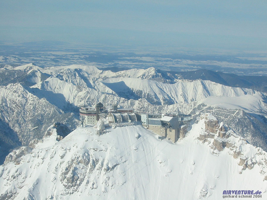 Höhe 10.500 Fuß - die Zugspitze aus der Adler-Perspektive bei strahlendem Sonnenschein. |