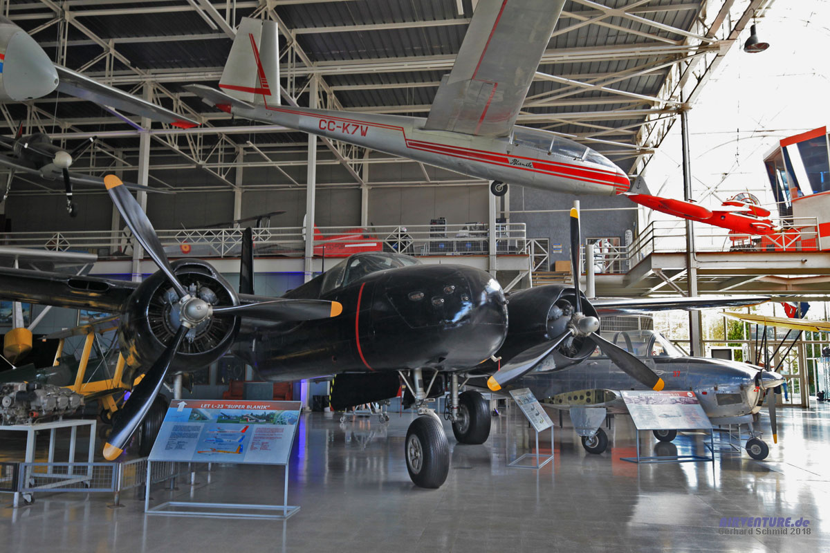 40 Douglas B-26 Invader zählten von 1954 bis 1972 zum Inventar der Chilenischen Luftwaffe. Darüber hängt ein LET L-23 Super Blanik Segelflugzeug aus tschechischer Produktion. |