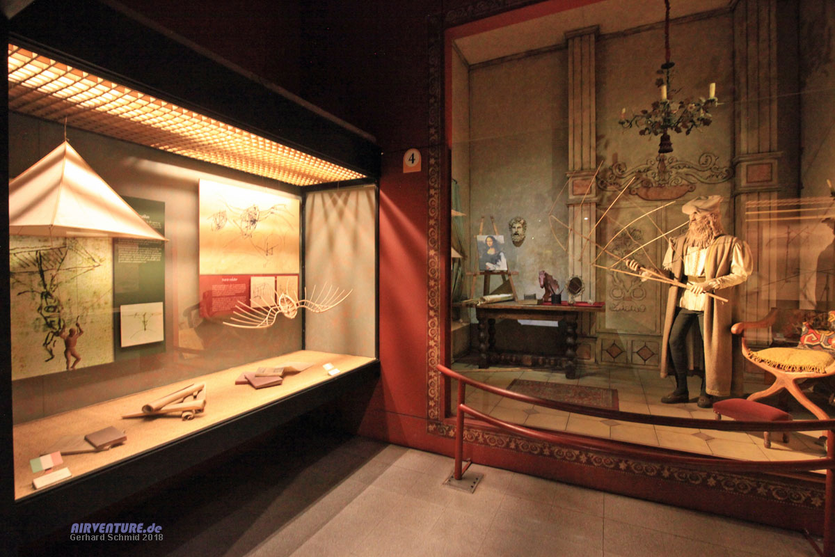 Durch die Geschichte der Luftfahrt führen im ersten Stock sehr aufwendige und schön gestaltete Dioramen, angefangen von einem lebensgroßen Leonardo da Vinci in seinem Arbeitszimmer bis zu den ersten Fliegern zu Beginn des 20. Jahrhunderts. Der Außenbereich hinter dem großen Museumshangar bietet dann noch viel Platz für diverse militärische und zivile Flugzeuge, die schon aufgrund ihrer Größe nicht in die Ausstellungsräume passen.