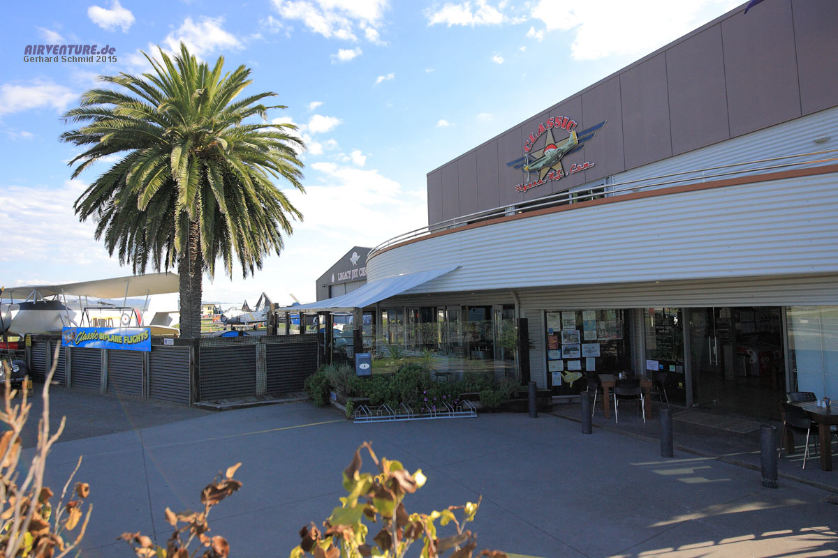 Folgt man dem Navigationssystem im Auto, ist man zunächst etwas irritiert, denn es weist den Weg in ein Gewerbegebiet. Der Tauranga Airport ist auf seiner Nordseite längst von einem Gewerbegebiet eingeholt worden, im Süden begrenzt die Bay den Flughafen. Der modern gestaltete Eingang zu Classic Flyers lässt zunächst eher auf ein Kino oder das Verwaltungsgebäude eines Industriebetriebs schließen, das Logo mit der Mustang vor dem Stern mit Schwingen bestätigt dann aber, dass man sein Ziel gefunden hat.