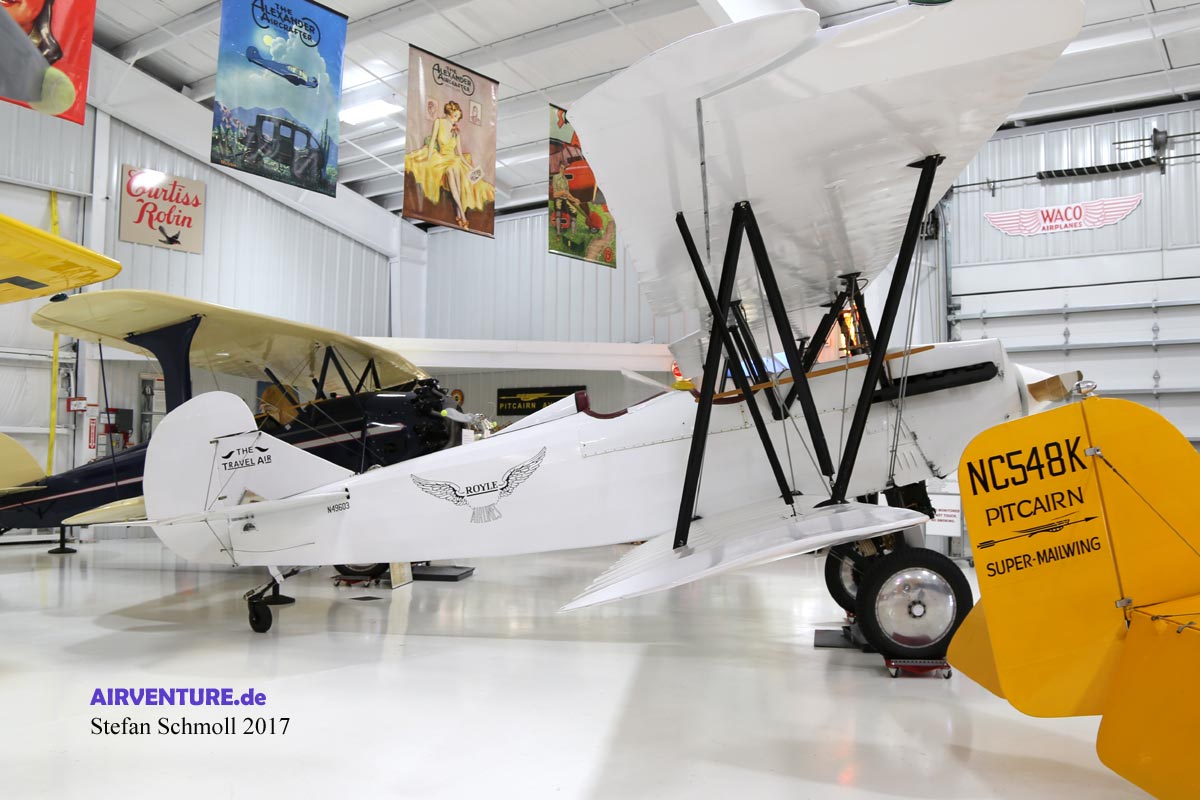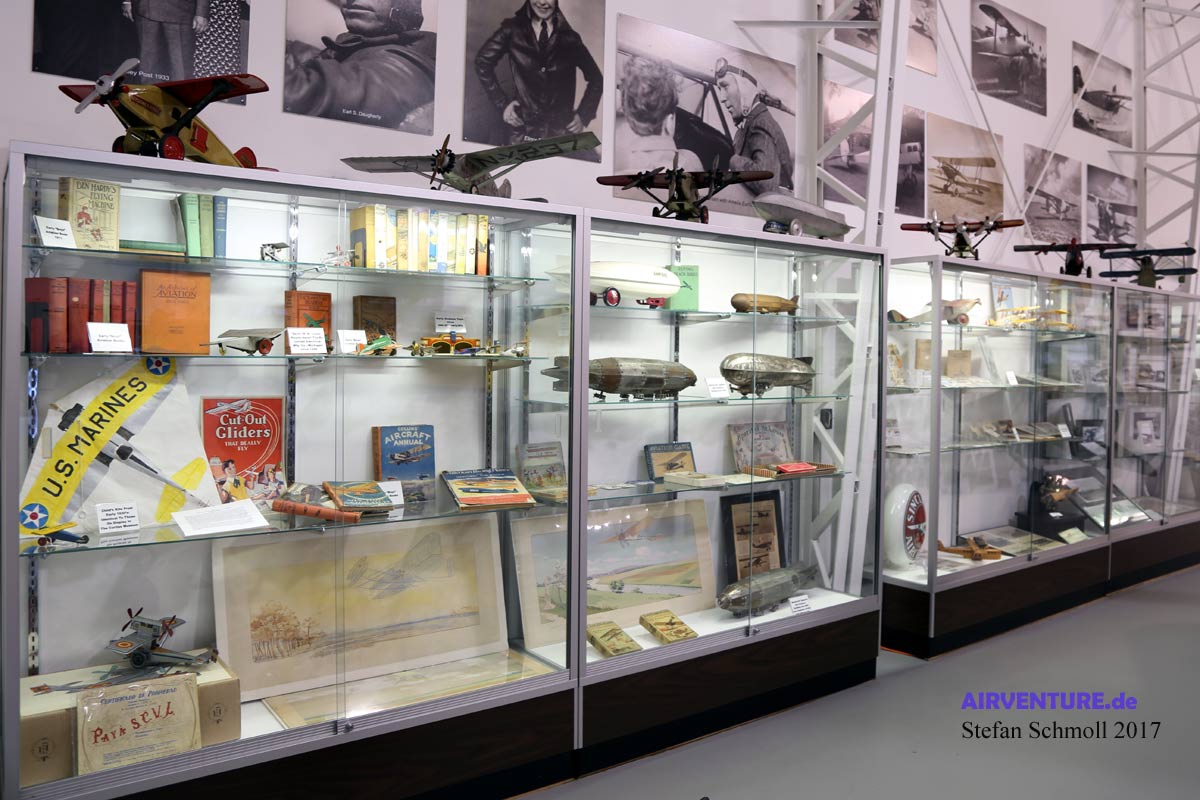 An der Decke hängt das einzige Segelflugzeug der Sammlung, ein Mead Schulgleiter von 1930. Rechts die General Aircraft Thunderbird. Der Doppeldecker gehörte dem berühmten Flieger Roscoe Turner. Besonderes Detail: Er packte einen großen Fallschirm in den Flieger und löste ihn als Rettungssystem aus ? beinahe unversehrt landeten Flugzeug und Pilot auf der Erde.