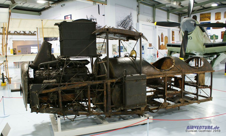 Es werden im Museum auch verschiedene Wracks gezeigt, unter anderem dieses Wrack eines Short 184 Doppeldeckers. Diese Maschine war seit 1917 im Bestand des Imperial War Museums und wurde 1940 bei einem deutschen Bombenangriff auf London zerstört. Beachtenswert ist, wie gut die Holzkonstruktion erhalten ist. |