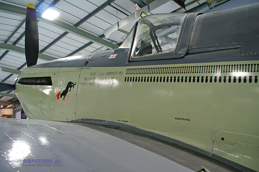 Eine wunderschöne Fairey Firefly FR IV mit der Kennung VH 127. Die Firefly hatte das große Rolls Royce Griffon Triebwerk mit einer Leistung von 2400 PS installiert. Die ausgestellte Maschine hat ein bewegtes Fliegerleben hinter sich. Sie wurde bei sehr vielen Sqd. eingesetzt und 1962 wurde beschlossen das die Maschine als Museumsexponat erhalten bleibt. |