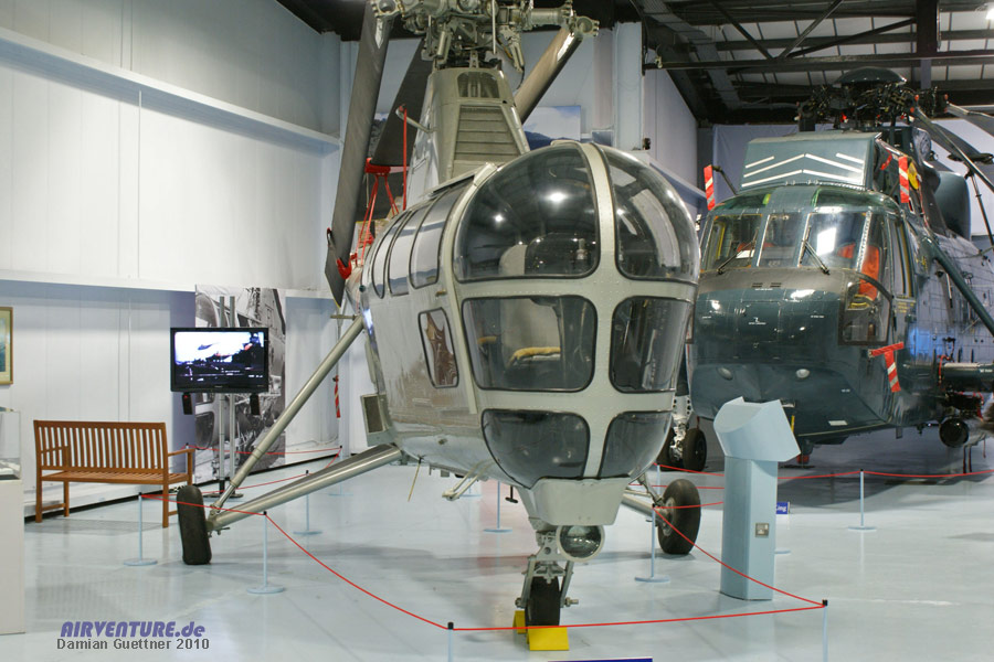 Die ungewöhnliche Westland Dragonfly HR5 von vorne. Durch das fast vollständig verglaste Rumpfvorderteil, war die Sicht sehr gut. Zur Platzersparnis konnte man die Rotorblätter zusammenfalten. |