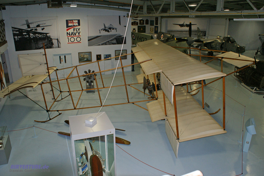 Eine wunderschöne Replika der Short S27 aus dem Jahr 1910. Das ganze Flugzeug besteht aus Holz, ist mit Stoff bespannt und zusätzlich mit Spanndrähten verspannt. Als Triebwerk hat die Maschine ein restauriertes aber nicht lauffähiges Orginaltriebwerk bekommen. |