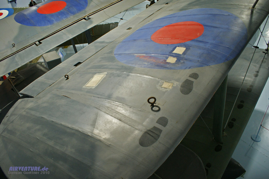 Die gefalteten Flügel der Supermarine Walrus. An den Haken in den Flügeln wurde die Maschine am Kran eingehängt und konnte aus dem Wasser herausgehoben werden. Die Fußabdrücke markieren den begehbaren Bereich der Tragfläche. Beachtenswert sind auch die Reparaturflicken. |