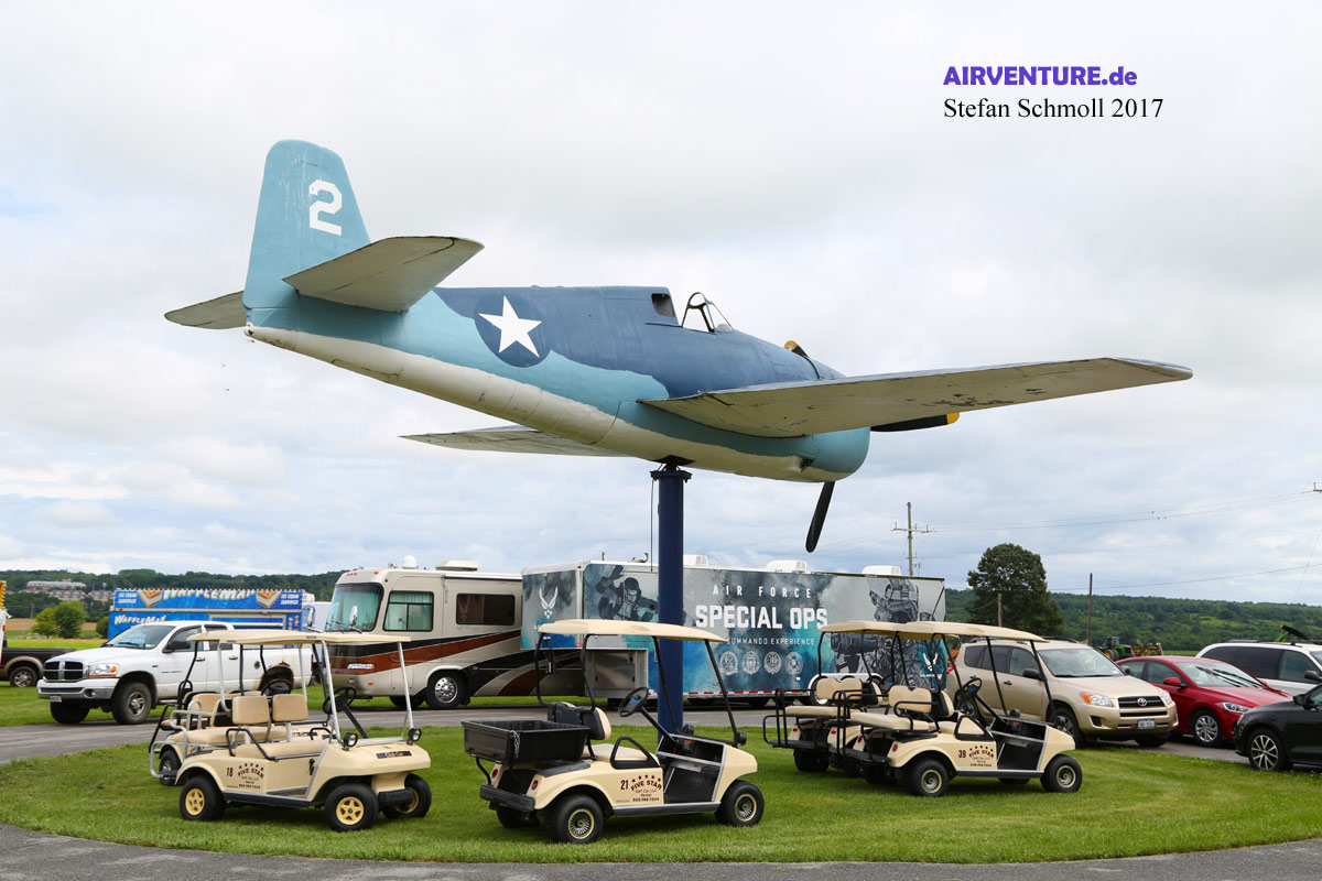 Beschämend wäre es, wenn man Heutzutage eine der letzten erhaltenen Grumman Hellcat irgendwo auf einen Pfeiler pfropft - ist aber zum Glück nur ein mehr oder weniger gelungener Nachbau.Sehr amerikanisch übrigens die ganzen Golfwagen darunter, die während der Show im Dauereinsatz waren. |