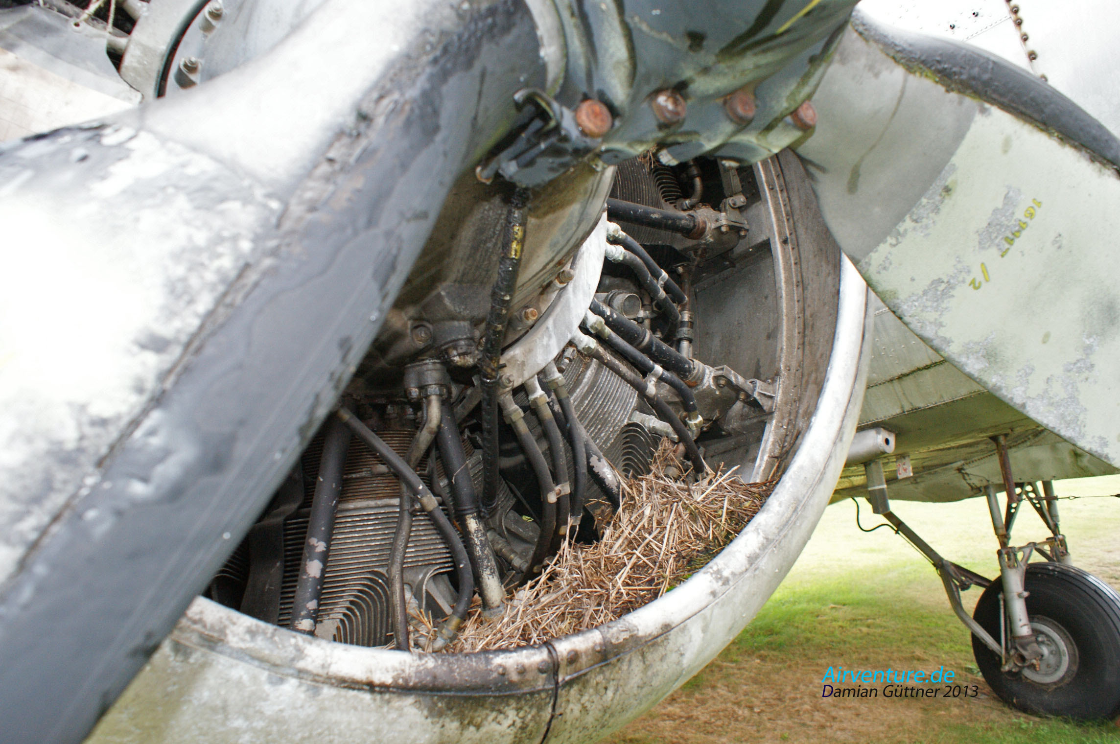 Die Standzeit der Maschinen im Museum zeigt ihre Wirkung. Im rechten Triebwerk der C-47 hat ein Vogel sein Nest gebaut. Vom Triebwerk bekommt er zwar keine Wärme mehr, aber etwas Schutz vor dem Wetter.