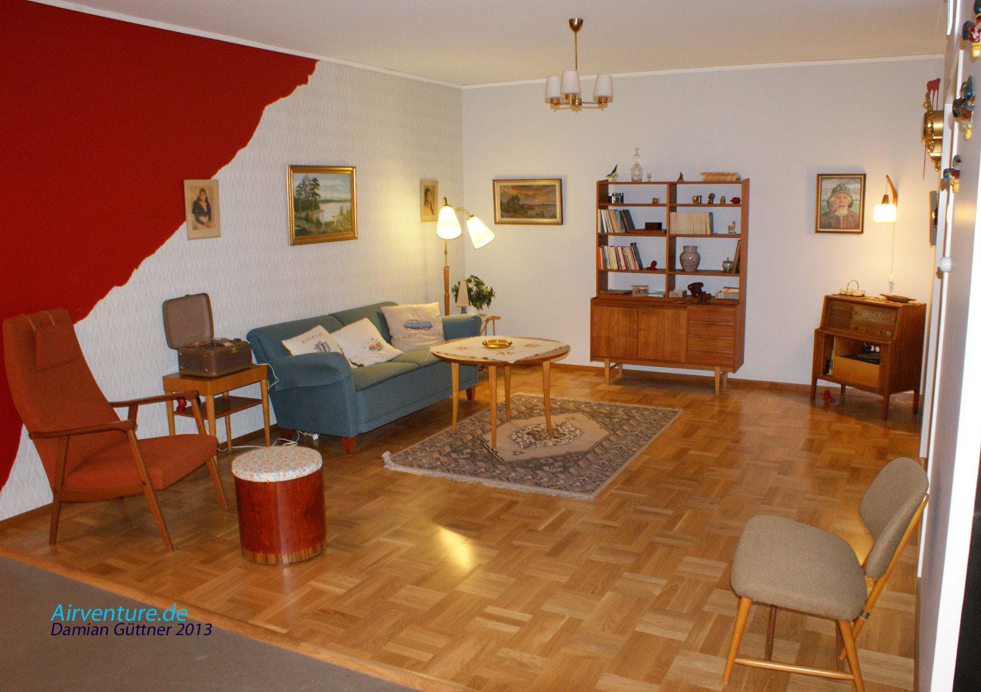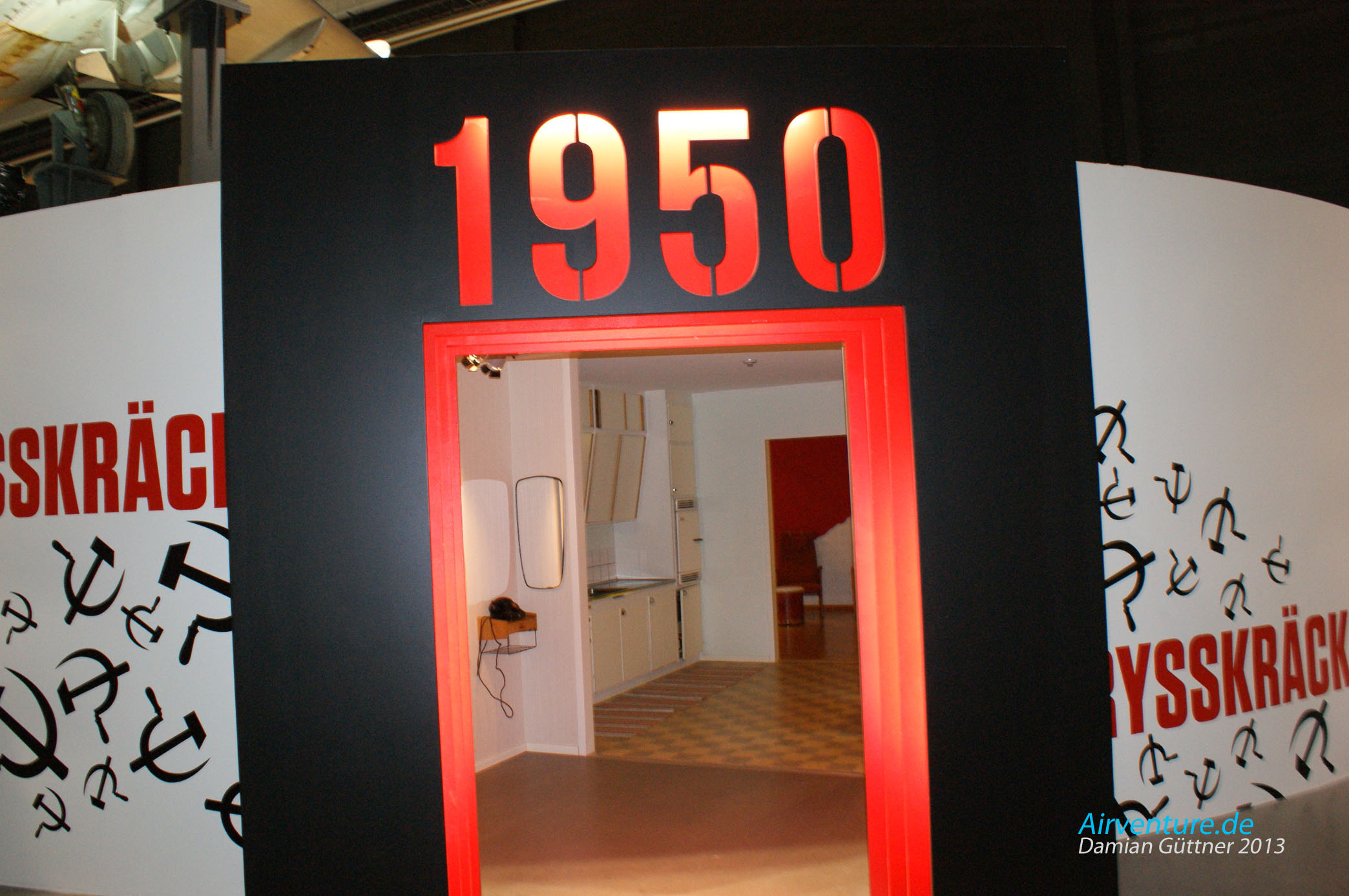 Der Eingang in die 50er Jahre Wohnung der Schweden. Es gibt noch die Nachbildungen der Wohnungen der 60er, 70er und 80er Jahre und darüber steht das zum jeweiligen Jahrzehnt passende Flugzeug.