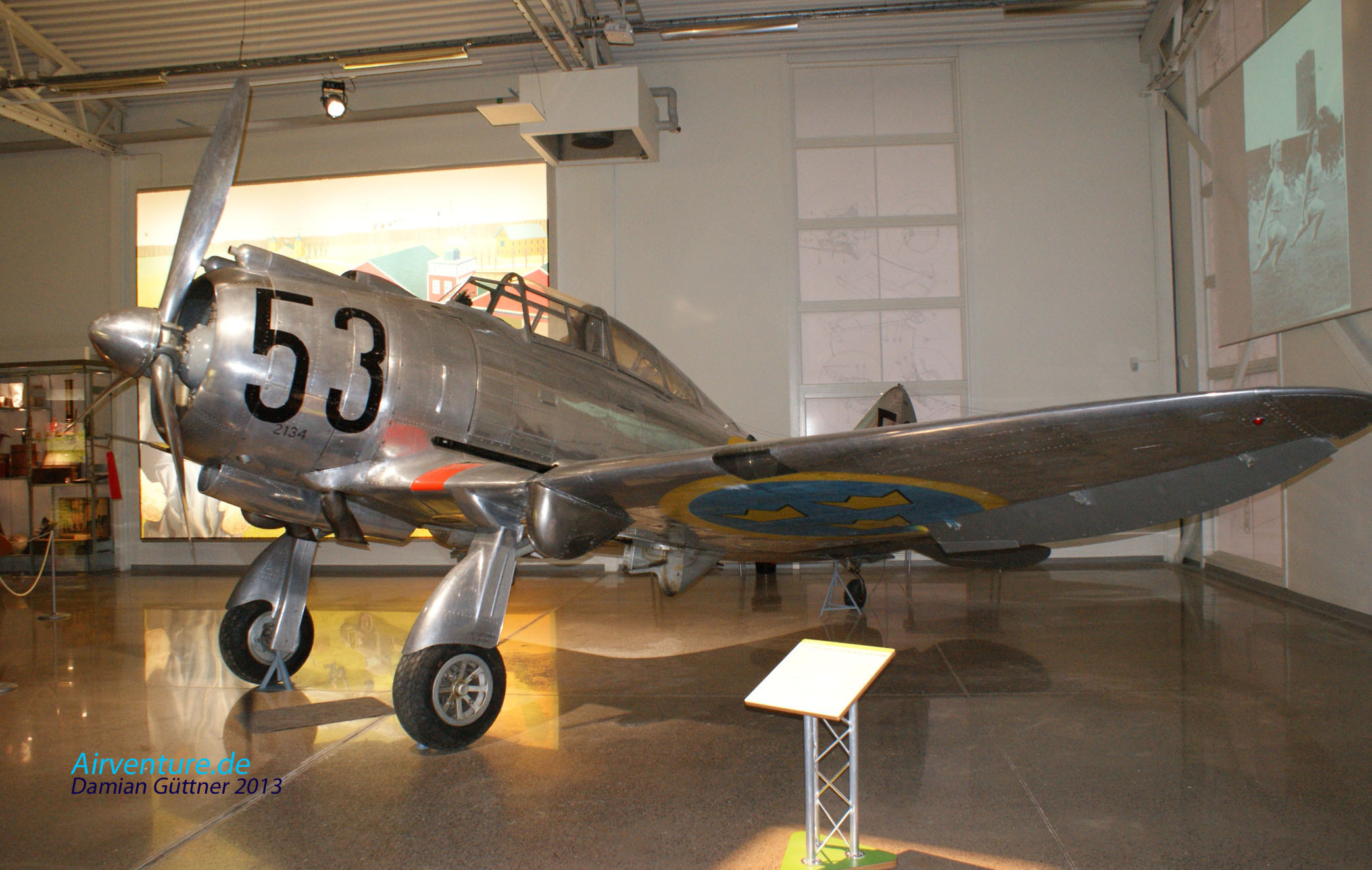Eine seltene und nur eine von zwei Existierenden Regiane Re 2000 Falco. Als das Flugzeug am 14. August 1942 in Schweden angekommen ist, bekam es die Bezeichnung J 20, BauNr. 2340. Zugeteilt wurde die Regiane dem F 10 Squadron und diente dort bis zum 20. Juli 1945. Danach waren die Flugstunden erreicht und man entschloss sich, es nicht zu verschrotten sondern einer Ausbildungseinheit zu schenken. Dort wurde die linke Seite für Ausbildungszwecke geöffnet.