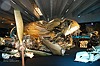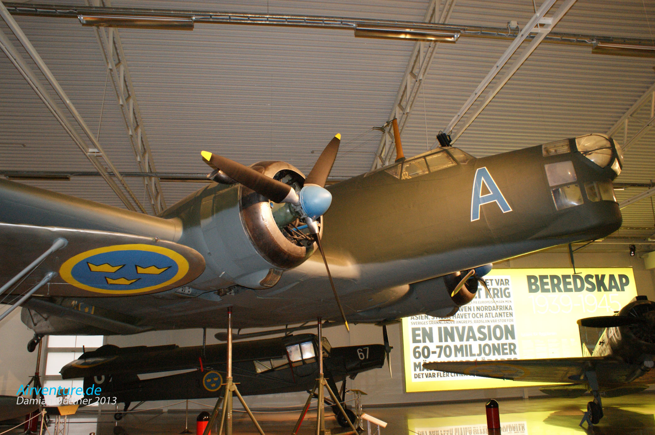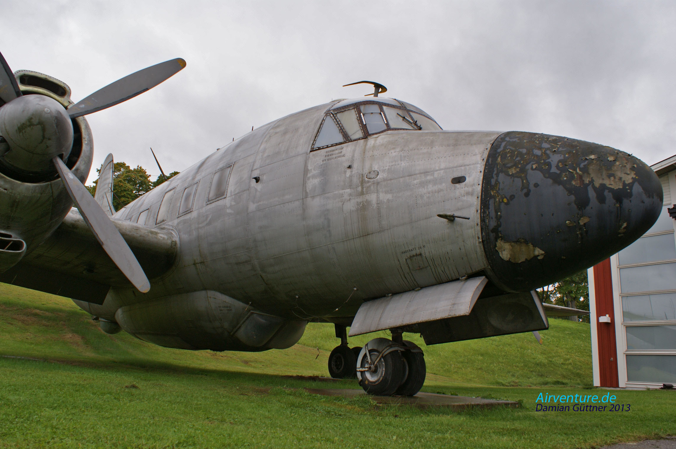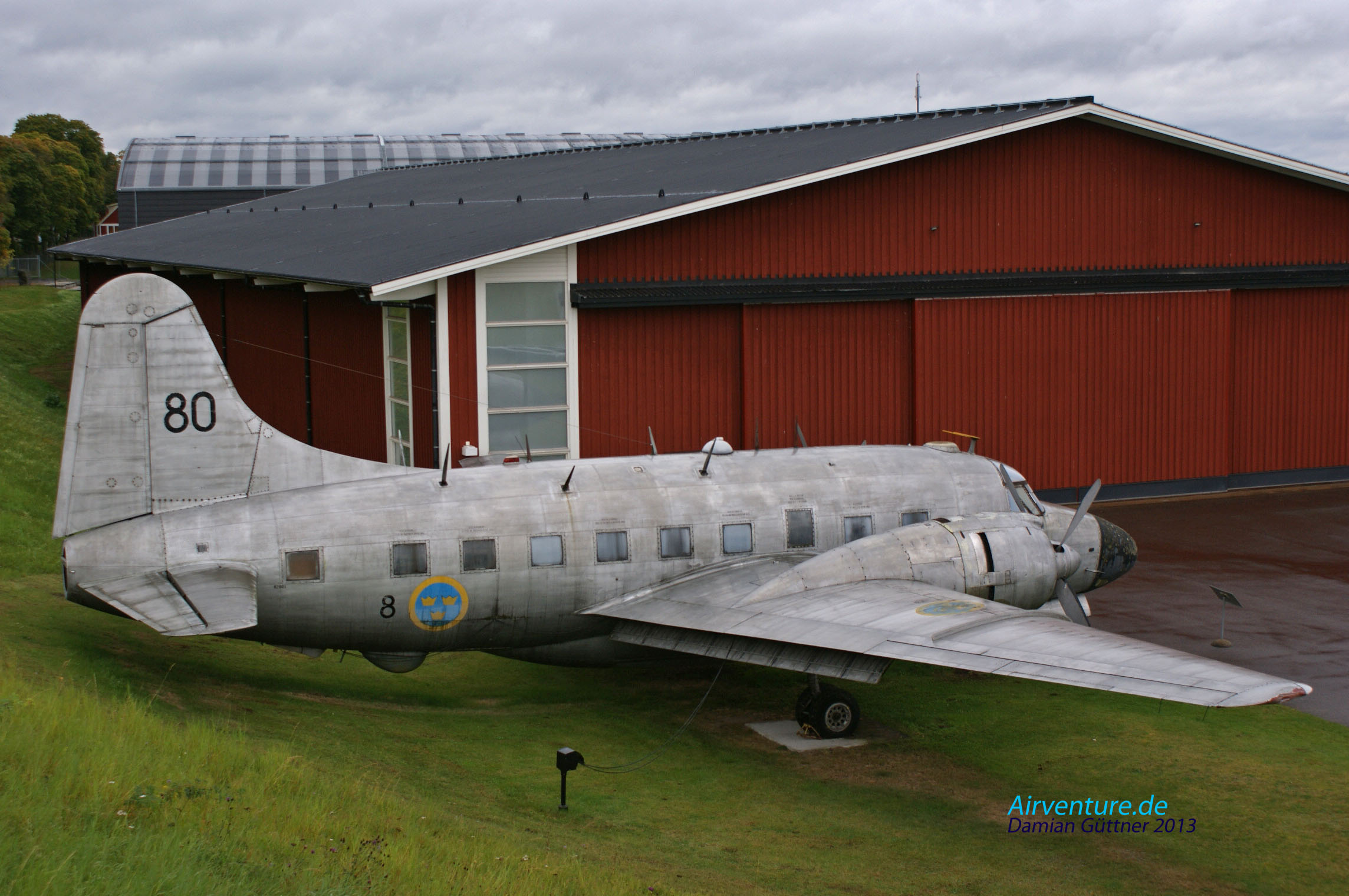 Das Wrack der Douglas DC 3 in der "Kellerausstellung". Diese Maschine ist Bj. 1942, wurde am 27. Januar 1943 an die US Air Force ausgeliefert, im Mai kam sie zur 9.  Air Force nach Nordafrika. Diese Maschine war dann am D-Day dabei, am 5 Februar 1946 kam sie nach Schweden, aber erst zwei Jahre später zur F 1 Squadron (nach der Umbenennung 1950 zum F 8 Squadron) der schwedischen Luftwaffe. Fast die ganze Zeit war die Maschine in Bromma stationiert und zur Schulung der Bordfunker eingesetzt. Am 13. Juni 1952 startete die DC 3 zu einem Routineschulungsflug, bei der Insel Gotland hat sich der Pilot dann etwas "verfranzt" und die Maschine geriet ins sowjetische Hoheitsgebiet. Daraufhin wurden sie von zwei MiG 15 abgefangen und abgeschossen, alle Besatzungsmitglieder starben.