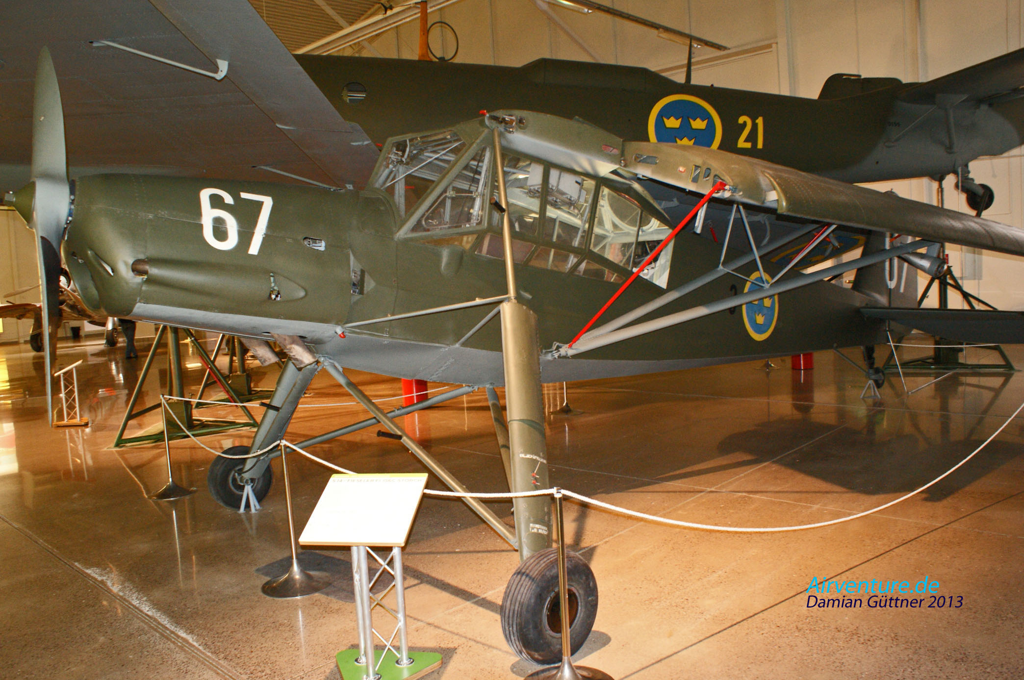 Die Schwedische Luftwaffe besaß mehrere Fiesler Fi 156 C Storch. Die ausgestellte Maschine ist Bj. 1938 und hat die WerkNr. 3815. Nach Außerdienststellung der Fi 156 im Jahr 1961 wurden alle Maschinen nach Österreich und Deutschland verkauft. Dank der guten Beziehungen von Saab nach Österreich, durch den Verkauf von Saab 91 und J29, konnte 1967 wieder ein Storch zurückgekauft werden.