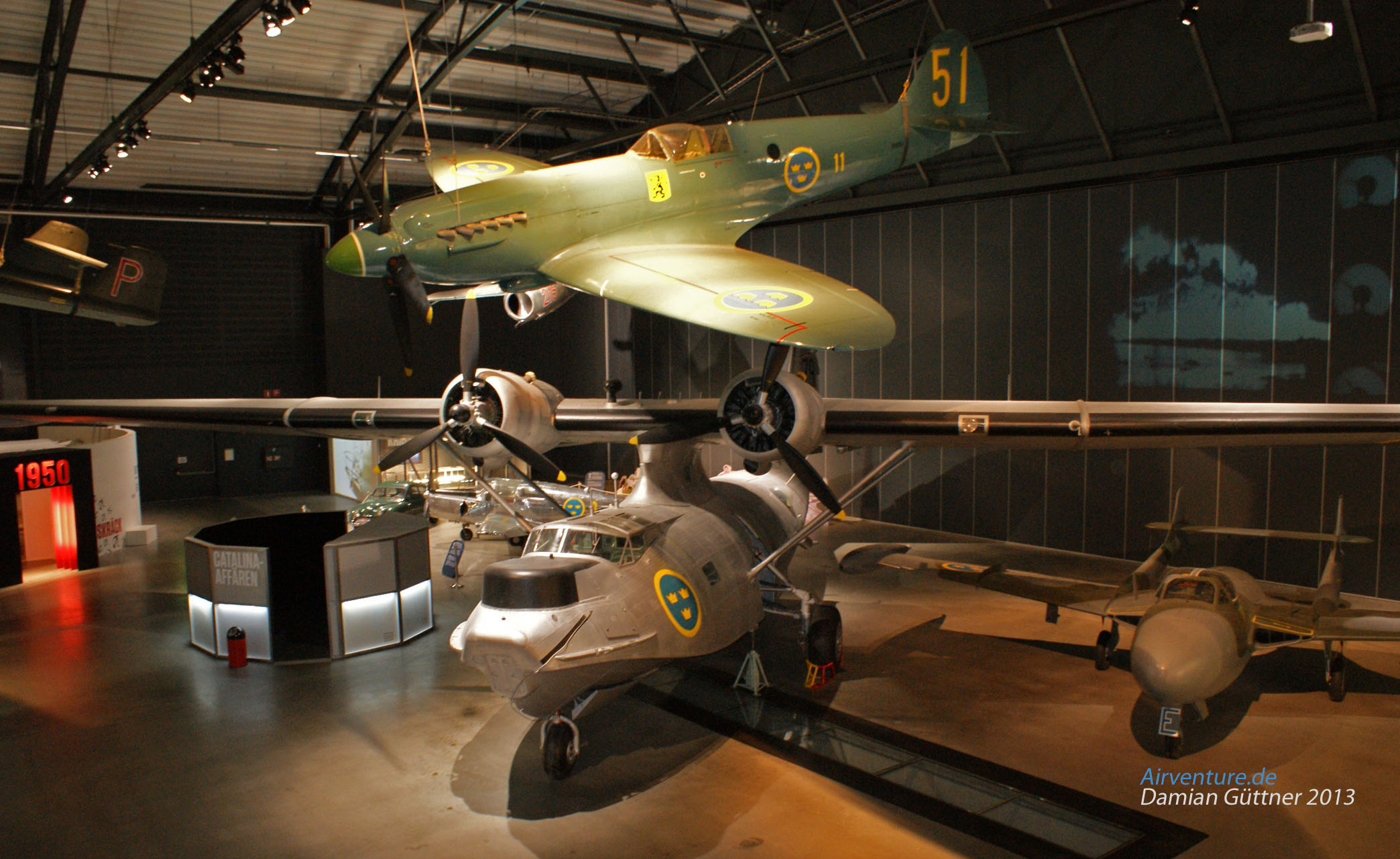 Ein Blick vom Eingang in die neue Halle mit den Exponaten des Kalten Krieges. Zwar gehören diese zwei Flugzeuge nicht zur der Epoche, sind aber trotzdem Interessant. Eine Spitfire Mk XIX, eine PBY 5-A Catalina und eine de Havilland Venom. Unter der Catalina ist der große Glasboden zu sehen, unter dem sich das Wrack der DC 3 befindet.