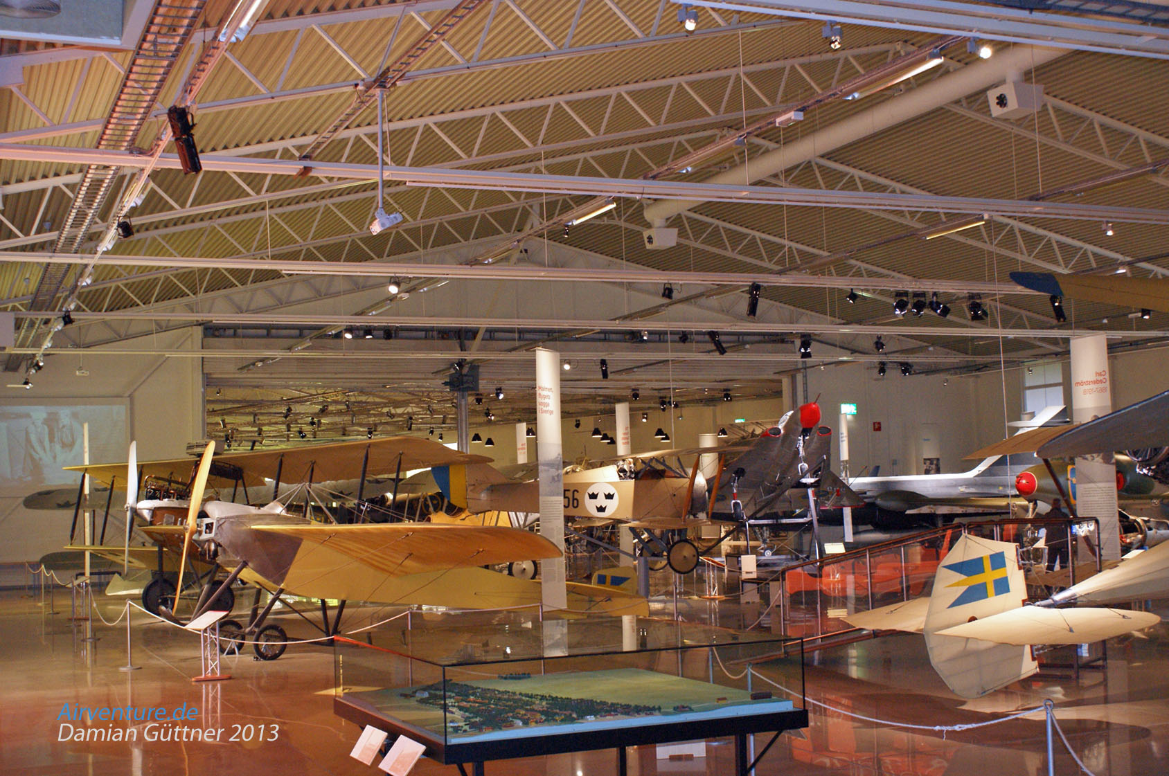 Ein Blick in die erste Halle, wo alle Maschinen aus den Anfängen der Fliegerei in Schweden untergebracht sind. Im Vordergrund steht ein Diorama, das zeigt wie der Flugplatz Linköping - Malmen zur Anfangszeit aussah. Leider reichen die Lichtverhältnisse nicht aus um gute Fotos zu machen.