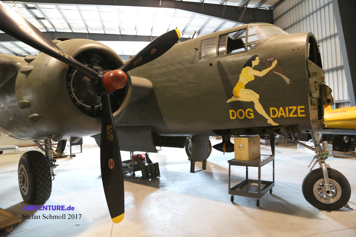 Leider ist neben der Douglas B-26 in der Ausstellung derzeit kein Platz mehr für die North-American B-25. Die seltene H Version mit der 7,5 cm Kanone im Bug ist eingelagert und kann daher leider nicht besichtigt werden. |