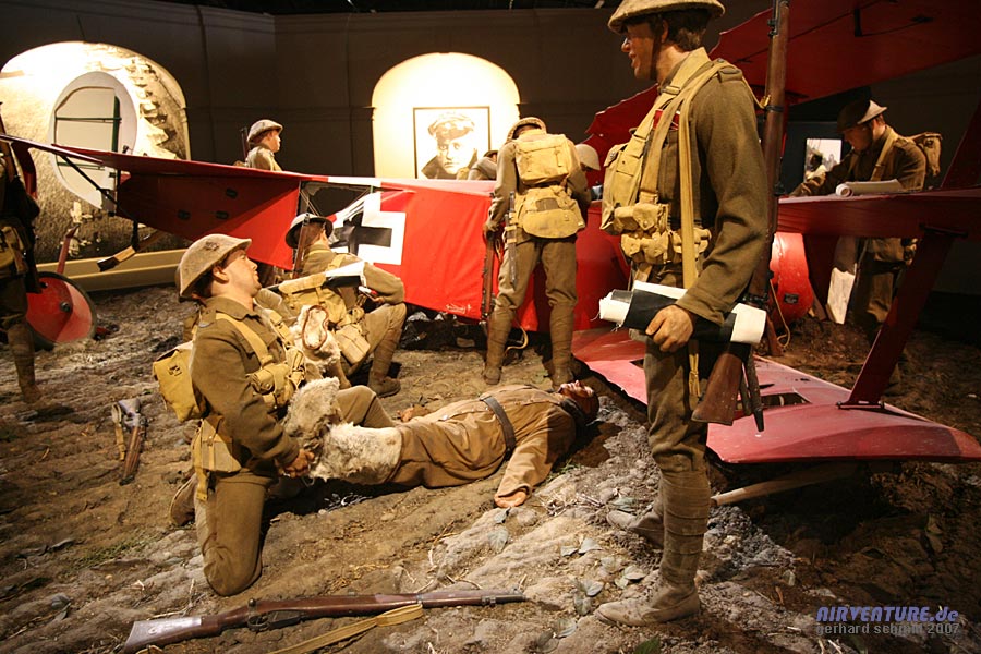 Das dramatischte Diorama im Museum zeigt, wie britische Infanteristen am Absturzort des "Roten Baron" Andenken sammeln - einschließlich der Pelzstiefel des tödich verletzt neben seinem Dreidecker liegenden Manfred Freiherr von Richthofen. |