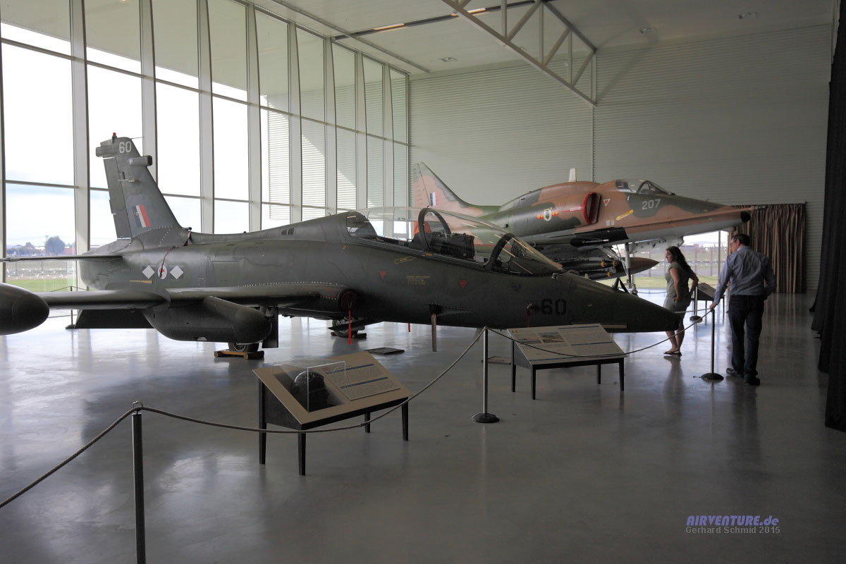 18 Aermacchi MB-339 wurden 1990 als Ersatz für die veralteten BAC Strikemaster angeschafft. NZ6460 flog auch mit dem Aerobatic Team "The Black Falcons". Die Douglas A-4 Skyhawk im Hintergrund ist eine Leihgabe der US NAVY. Eigentlich eine A-4L wird sie als A-4K ausgestellt, wie sie die RNZAF in den 70er Jahren flog. |
