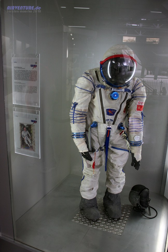 Die Ausstellung wird durch einige (Russische) Raumanzüge ergänzt. Der hier gezeigte Sokol KV-2 wurde erstmals 1980 eingesetzt und kostet ca. 30.000 Euro. Weiter Infos finden Sie bei Wikipedia: >>>Link |