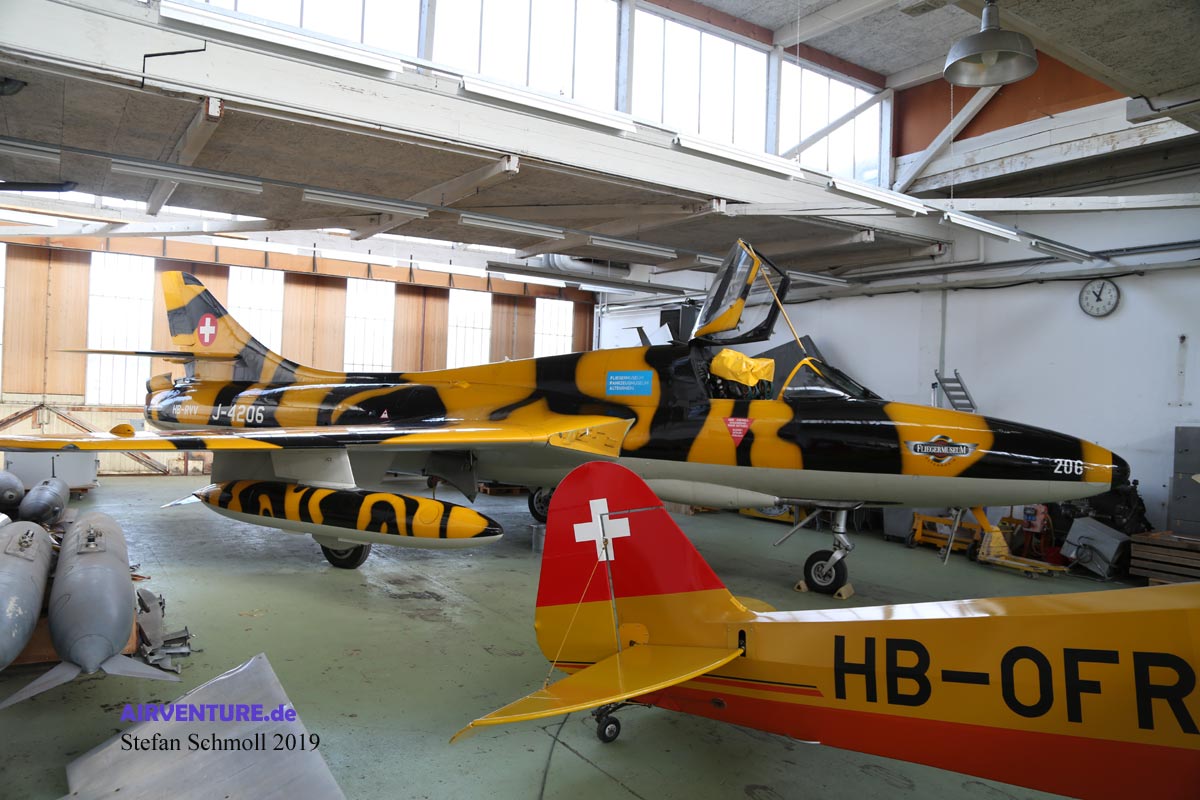 Die Hunter T.68 J-4206 ist wohl die bunteste noch fliegende Hawker Hunter in der Schweiz. Die Tiger-Lackierung erhielt sie als Teil der "Fliegerstaffel 11". Die in Meiringen beheimatete Staffel fliegt derzeit F/A-18 Hornet. Ausgemustert wurde die Hunter vor 25 Jahren.