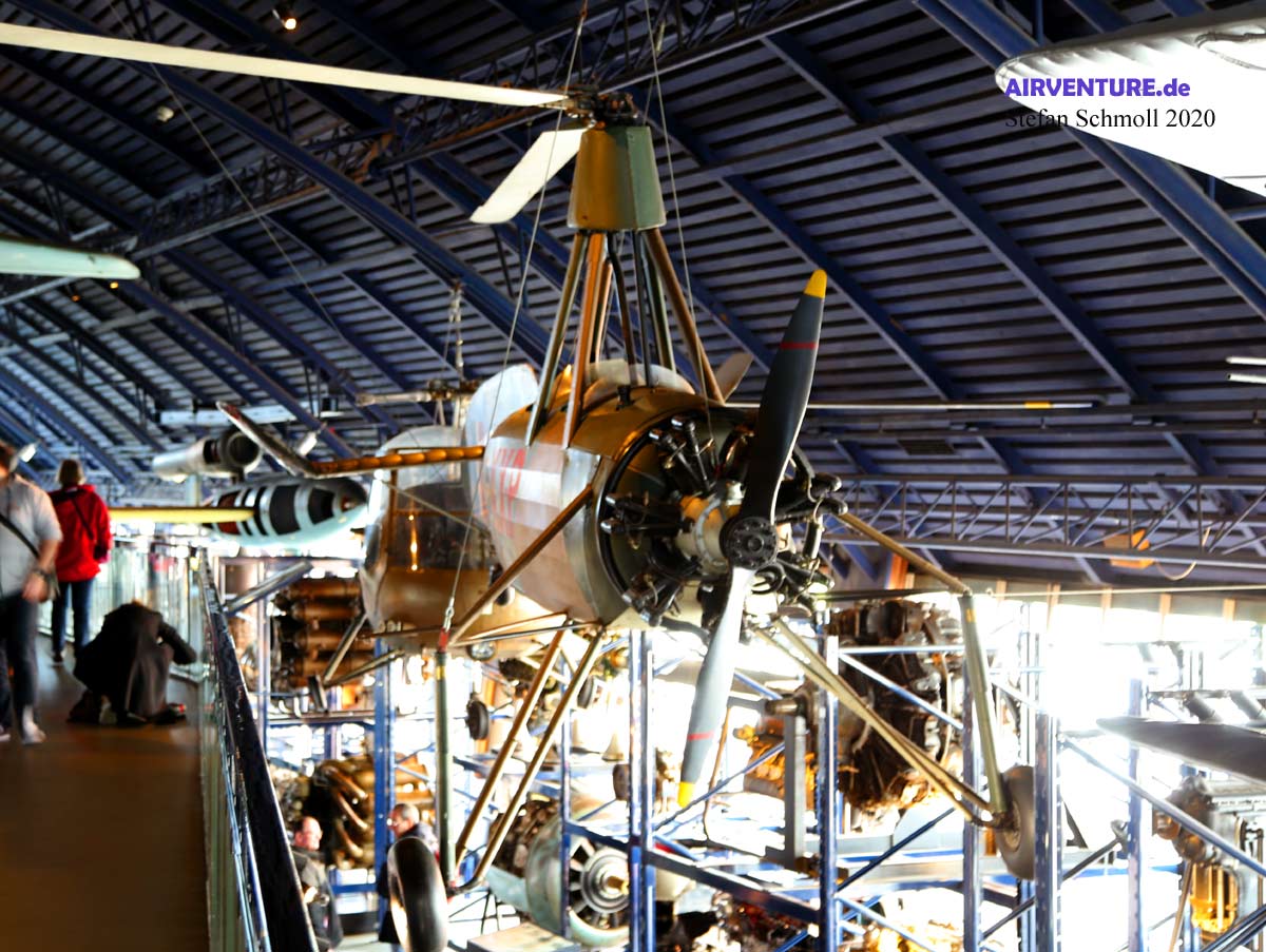 Neben all diesen fliegenden Schätzen liegt der weitere Fokus in einer umfangreichen Motorensammlung. Auch hier hat die Präsentation einen ganz besonderen Charme: Dutzende Flugmotoren sind in einem riesigen blauen Gestell verschraubt, so dass man sie sich perfekt von allen Seiten aus betrachten kann.