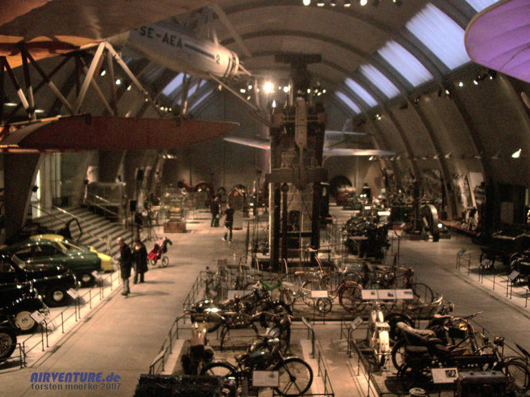 Ein Blick in die zentrale Maschinenhalle des Museums. Hier werden Grossgeräte wie Flugzeuge, Autos, Eisenbahnen und Dampfmaschinen ausgestellt. | |
