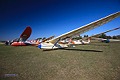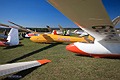 Die doppelsitzige englische Slingsby T 21 mit ihrem offenen side-by-side Cockpit (links) und die von der Wasserkuppe angereiste Gö-1 Wolf warten auf ihren nächsten Flug. Dahinter (rechts) schließt sich eine Ka6CR aus der Schweiz an. |