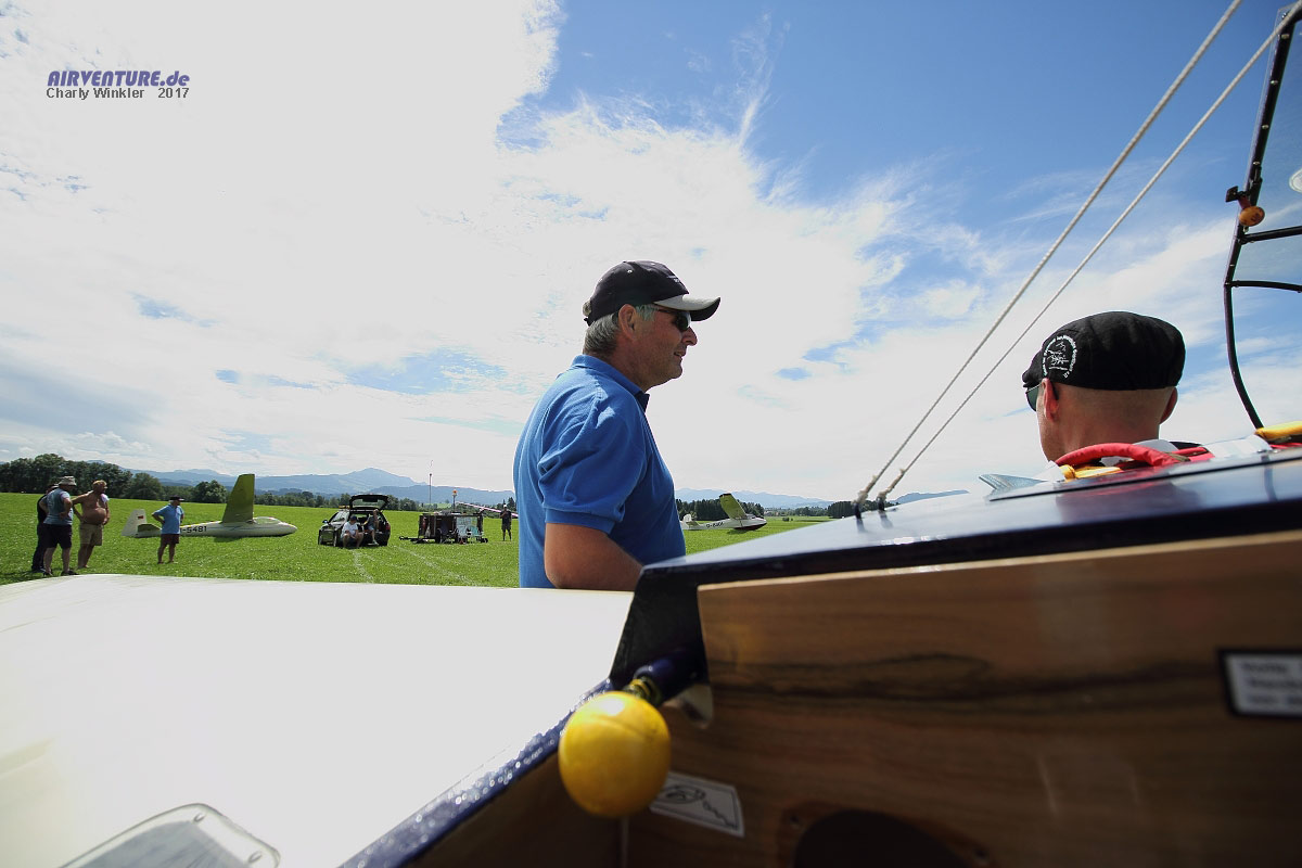 Nicht ganz so große Aufmerksamkeit wird den Oldtimer-Segelfliegern zuteil. Klar, die hölzernen Langflügler verkünden nicht schon aus hunderten Metern Entfernung mit Hilfe eines brüllenden V-12 oder Sternmotors ihre Anwesenheit . Selbst bei einem tiefen Vorbeiflug geben Sie nicht viel mehr als in leises Säuseln von sich. Sie sind die sanften, die leisen Vertreter einer Zeit, in der das Fliegen noch Abenteuer war, ohne Glascockpit und Endanflugrechner, dafür mit jeder Menge Pioniergeist und auch ein klein Wenig Gottvertrauen...