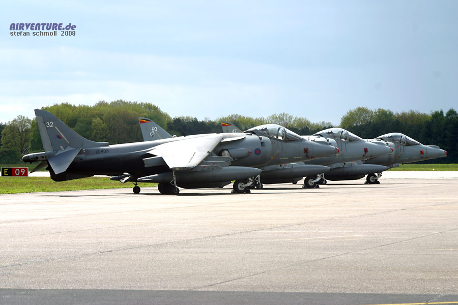 Gleich VIER Senkrechtstarter vom Typ Harrier GR.7/9 aus RAF Cottesmore flogen zum Geburtstag ein. Die zahlreichen Spotter aus Deutschland und den Niederlanden waren begeistert. Es ist für die Veranstalter sicher nicht einfach gewesen, so viel moderne Hardware aus England zur Geburtstagsfeier zu organisieren.
