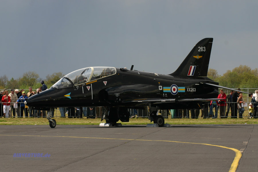 Am Teilnehmerfeld merkte man schnell, dass es sich beim Airport Weeze um eine ehemalige britische Basis gehandelt hat. So kam die halbe Royal Air Force zum Gratulieren an den Niederrhein. Hier sehen wir eine BAe Hawk T.1 der 208. Staffel aus RAF Valley.