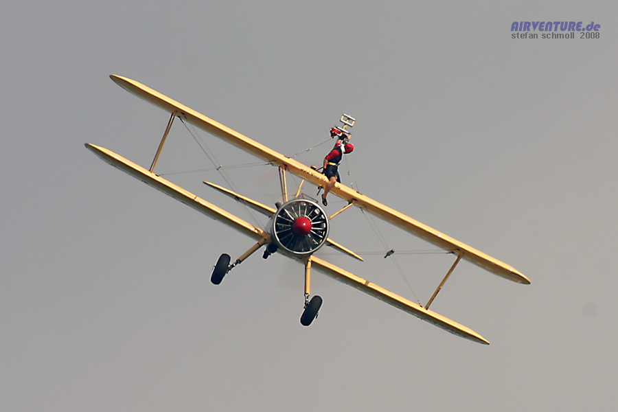 Peggy Krainz in Aktion. Egal ob ILA Berlin, Al Ain Airshow in den Vereinigten Arabischen Emiraten - oder der ZDF Fernsehgarten - Die Wingwalker Demonstration mit der Boeing Stearman kommt überall phantastisch an. Nächste Termine finden Sie auf Peggys Homepage http://www.wing-walkers.de