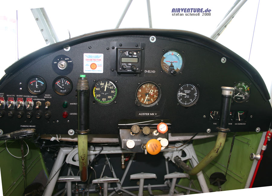 Im Gegensatz zur wesentlich bekannteren Piper Cub sitzen in der britischen Auster Pilot und Co-Pilot nebeneinander. Der Blick auf das Instrumentenbrett zeigt, wie wenig Instrumente eigentlich notwendig sind, um ein Flugzeug zu fliegen. |