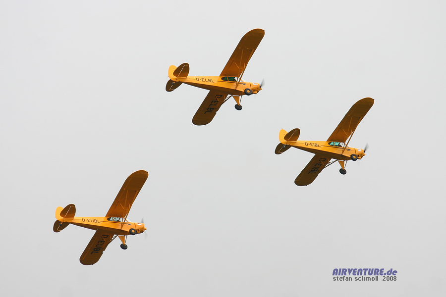 Nachdem wir ja bereits über die in Deutschland seltene Auster MK.V berichteten, haben wir hier mit der amerikanischen Piper Pa-18 Super Cub das wesentlich erfolgreichere Gegenstück. Über mehrere Jahrzehnte wurden mehr als 40.000 Exemplare der Modellfamilie gebaut, von denen noch immer unzählige auf der ganzen Welt fliegen. Aber in Wershofen flog nicht nur eine Super Cub, sondern gleich drei - und das in enger Formation. |