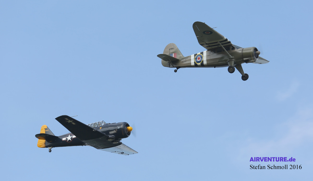 Eine Augen- und Ohrenweide war die niederländische Oldtimerformation aus Stinson und Harvard. Der Eigentümer der T-6 wählte das Kennzeichen N13FY. Wobei böse Zungen munkeln, dass er das "FY" wegen diverser Zulassungsprobleme vor einem Jahrzehnt bei der Maschine gewählt hatte. |