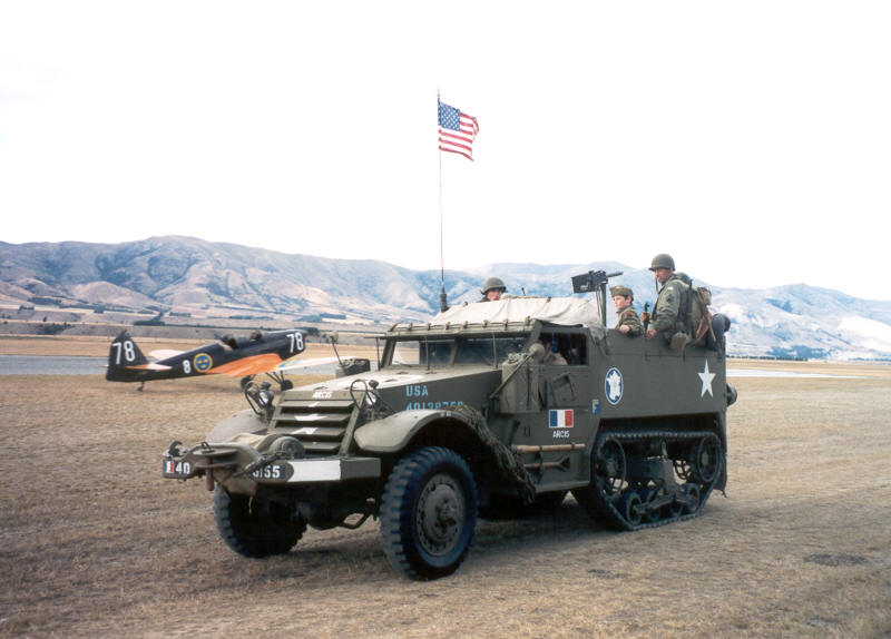 Halbkette Während im Hintergrund die Klemm 35 D vorbeirollt, sind im Vordergrund die "Warhorses at Wanaka" aktiv. Die "Warhorses"-Gruppe unterstützt die Flugvorführungen der Warbirds aus dem Zweiten Weltkrieg mit der Demonstration ihrer Sammlung von Militärfahrzeugen. Hier zu sehen eins der berühmten amerikanischen "M3"- Halbkettenfahrzeuge. Die aufwendigen Gefechtsdarstellunen zu Lande und in der Luft mit reichlichem Einsatz von Pyrotechnik sind sehr beeindruckend!