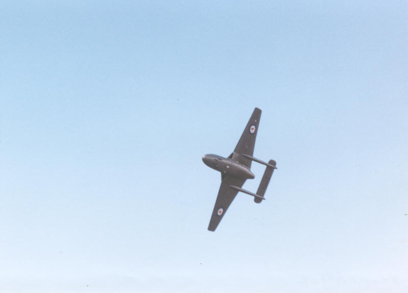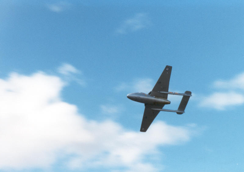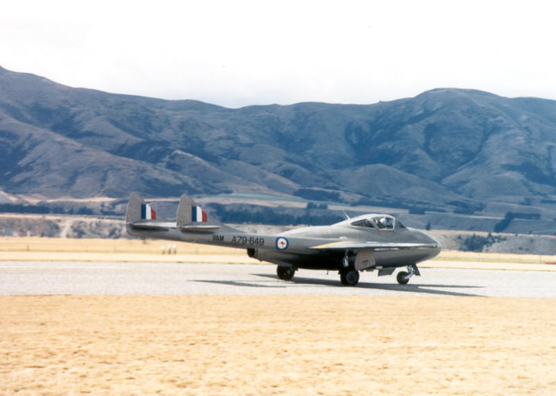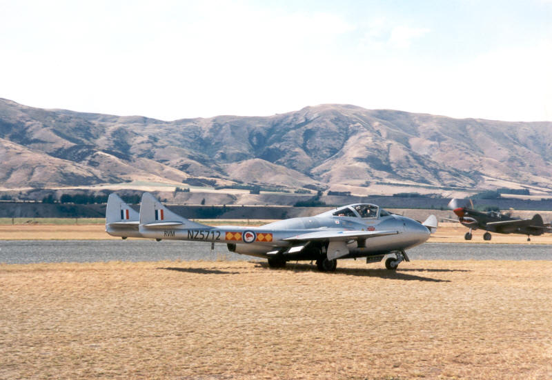 Im Flugprogramm der Warbirds over Wanaka Airshow 2002 waren auch Jet-Wabirds zu sehen. Es flogen gleich zwei Exemplare der legendären De Havilland Vampire. Dieser Flugzeugtyp wurde schon während des Zweiten Weltkriegs entwickelt aber erst nach Kriegsende in großer Zahl gebaut und in etlichen Ländern in Dienst gestellt, wo sich die Vampires hervorragend bewährten. Besonders berühmt wurden die Vampires bei der Schweizer Luftwaffe, wo sie deutlich über 30 Jahre lang im Dienst standen! Diese Vampire hier trägt zusätzlich zum heutigen Zvilkennzeichen die Markierungen der Royal New Zealand Air Force, die Vampires 20 Jahre lang eingesetzt hat, bis sie im Jahre 1972 durch die BAC Strikemaster ersetzt wurden.