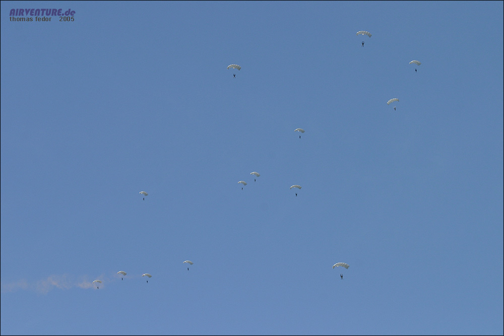 Immer wieder gern gesehen, das Absetzmanöver der Transall. Ein kleiner Schirm zieht einen größeren Schirm aus dem Heck. Dieser zieht dann die Ladung aus dem Flugzeug.