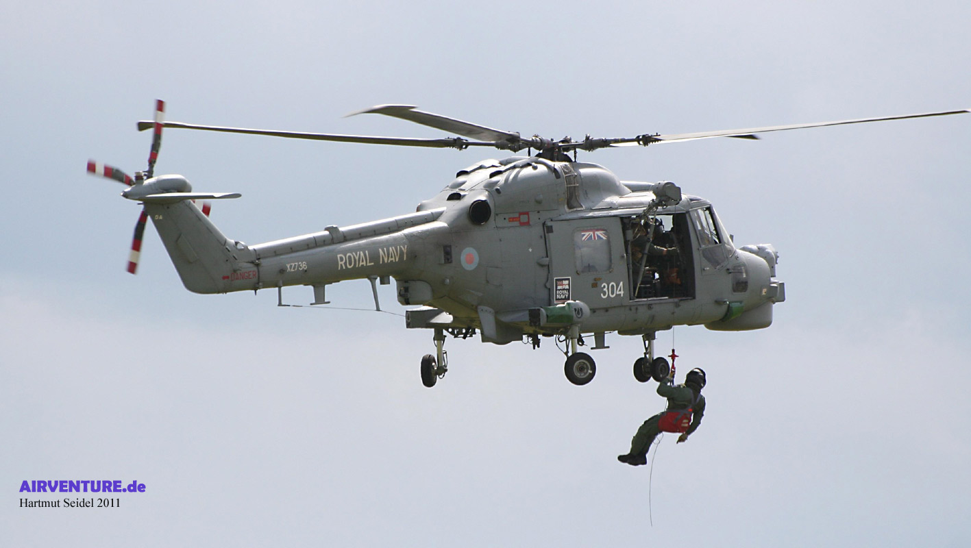 Im Jahre 1971 flog zum ersten Mal der Prototyp des erfolgreichen "Lynx"-Hubschraubers. Der RNAS Yeovilton International Air Day 2011 hatte daher das offizielle Thema "Celebrating 40 Years of the Lynx Helicopter". Im Rahmen dieses Jubiläums begannen die Flugvorführungen des Air Day 2011 mit einem Formationsüberflug von 9 Westland Lynx. Hier startet gerade ein Royal Navy Lynx-Hubschrauber der 815 Squadron zur Teilnahme an der Formation. |