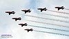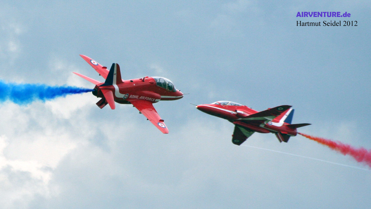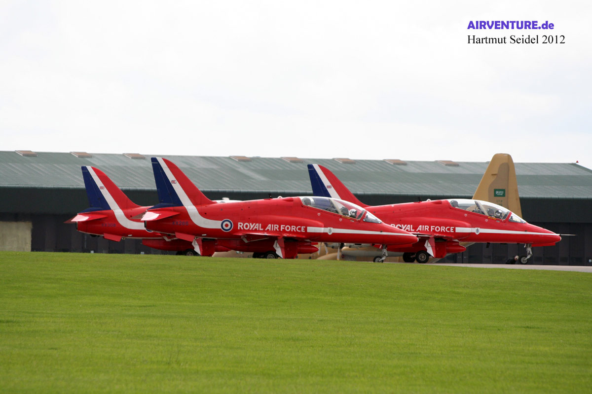 Die Red Arrows zeigen ihre eindrucksvollen Flugvorführungen normalerweise mit neun Maschinen vom Typ British Aerospace Hawk. Aus verschiedenen Gründen flogen die Red Arrows in der gesamten Airshowsaison 2012 aber nur mit sieben Maschinen. |