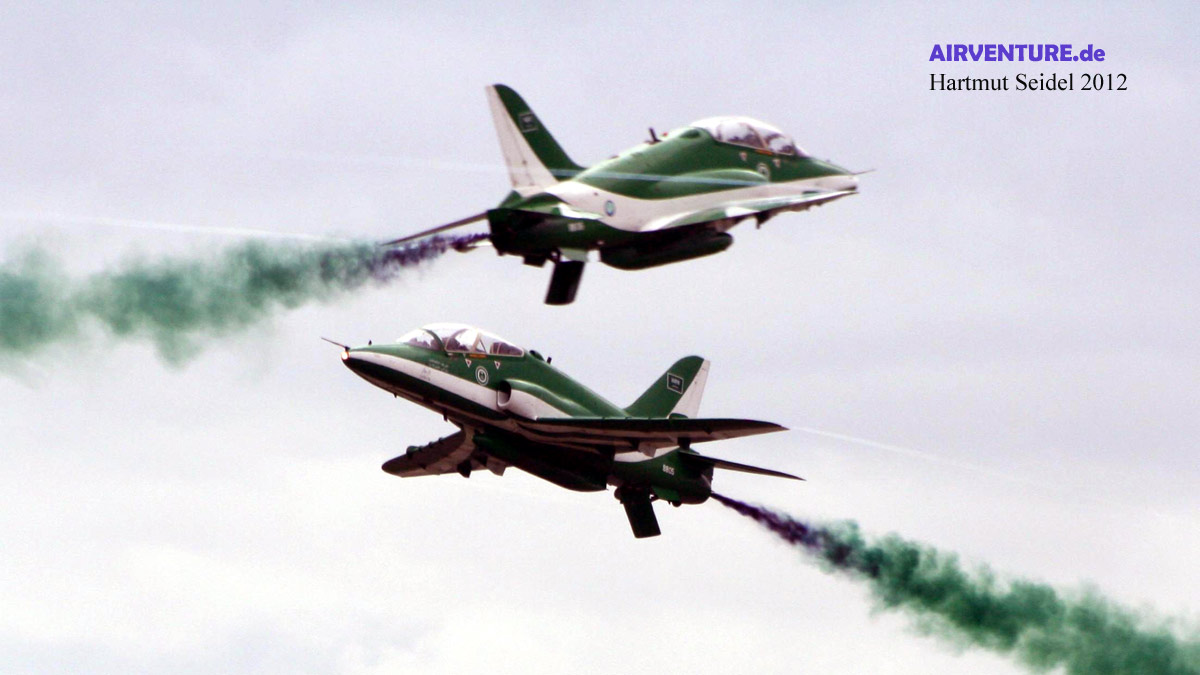 Mit dem "Saudi Hawks" Display Team der Luftstreitkräfte von Saudi-Arabien ( Royal Saudi Air Force ) wurde dem Publikum des RNAS Yeovilton International Air Day 2012 auch die Vorführung eines bisher in Europa nur sehr selten zu sehenden ausländisches Kunstflugteams geboten. |