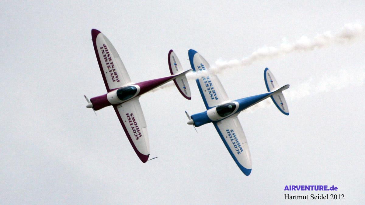 Peter Wells und Guy Westgate vom SWIP Team zeigen ihre Flugvorführungen mit zwei Maschinen vom Typ Silence Twister. Der Name des Flugzeugs erklärt auch den früheren Namen des Teams : "Twister Duo". Der aktuelle Name "SWIP" ist die Abkürzung des jetzigen Team-Sponsors : "Scottish Widows Investment Partnership".