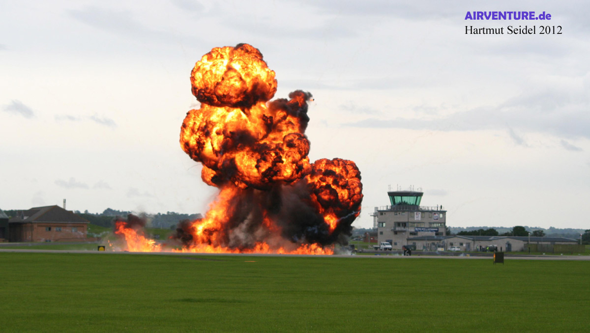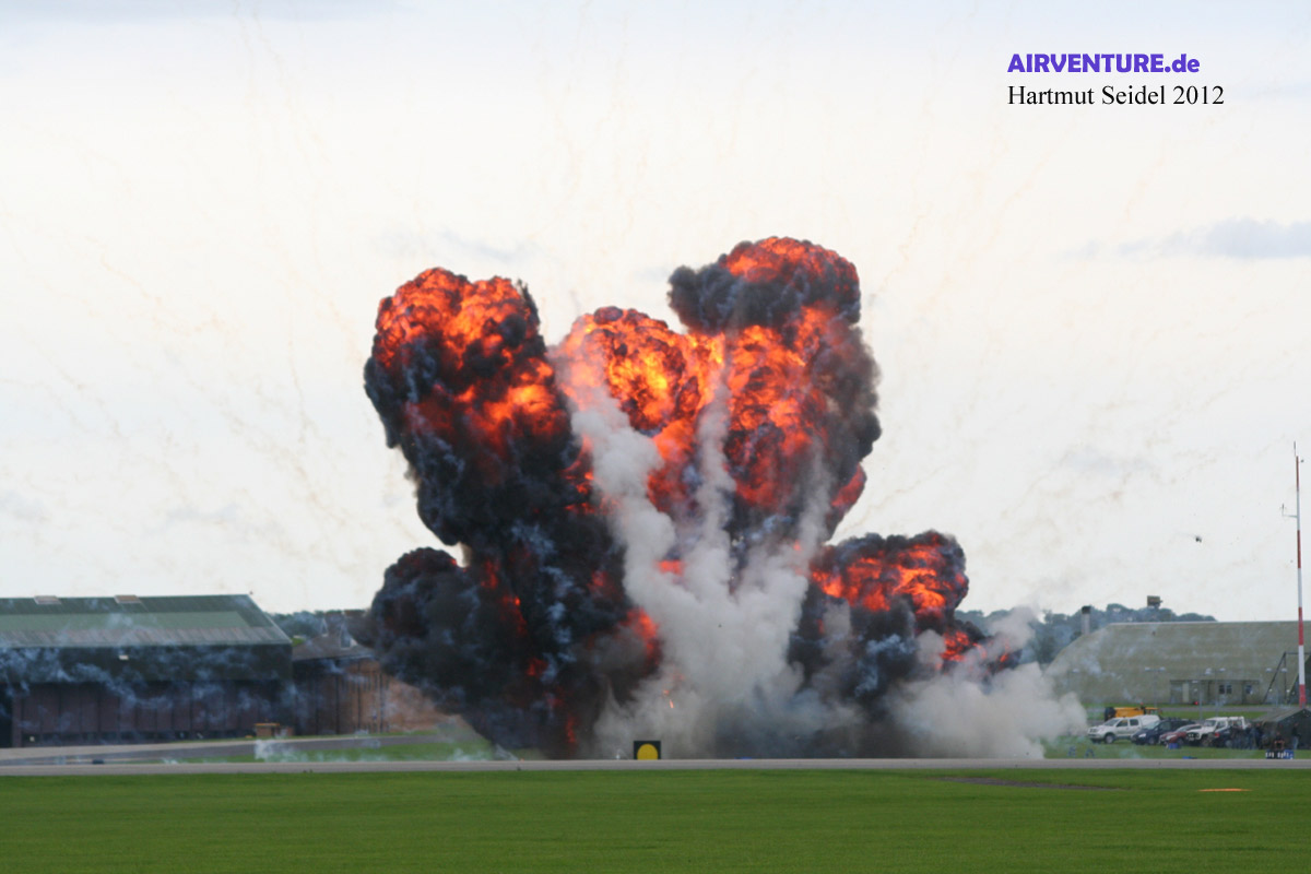 .....bei der - wie hier zu sehen ist - die Pyrotechniker am Boden auch wieder alle Hände voll zu tun gehabt haben, um die Bombenexplosionen und Raketeneinschläge des simulierten Angriffs der beiden Tornados richtig in Szene zu setzen. |