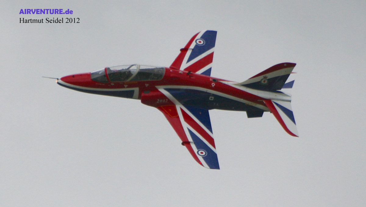 Die RAF Solo-Vorführung mit dieser farbenfroh angestrichenen Hawk wurde während des RNAS Yeovilton International Air Day 2012 geflogen von Flight Lieutenant Philip Bird von der 208 Squadron der No 4 Flying Training School mit Heimatbasis auf dem Royal Air Force Fliegerhorst Valley, gelegen auf der zu Wales gehörenden Insel Anglesey. |