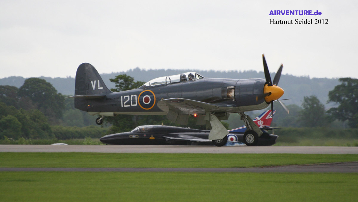 Während im Hintergrund die Hawker Hunter T 7 A in Richtung Startbahn rollt, landet hier gerade mit dieser Hawker Sea Fury T 20 der Royal Navy Historic Flight eine andere berühmte alte Konstruktion des britischen Flugzeugherstellers Hawker nach einer eindrucksvollen Vorführung. Mehr zu den Solo-Displays mit Propellerflugzeugen wie der Hawker Sea Fury im Flugprogramm des Yeovilton International Air Day 2012 gibt es in Teil 4 dieses Berichts zu sehen ! |