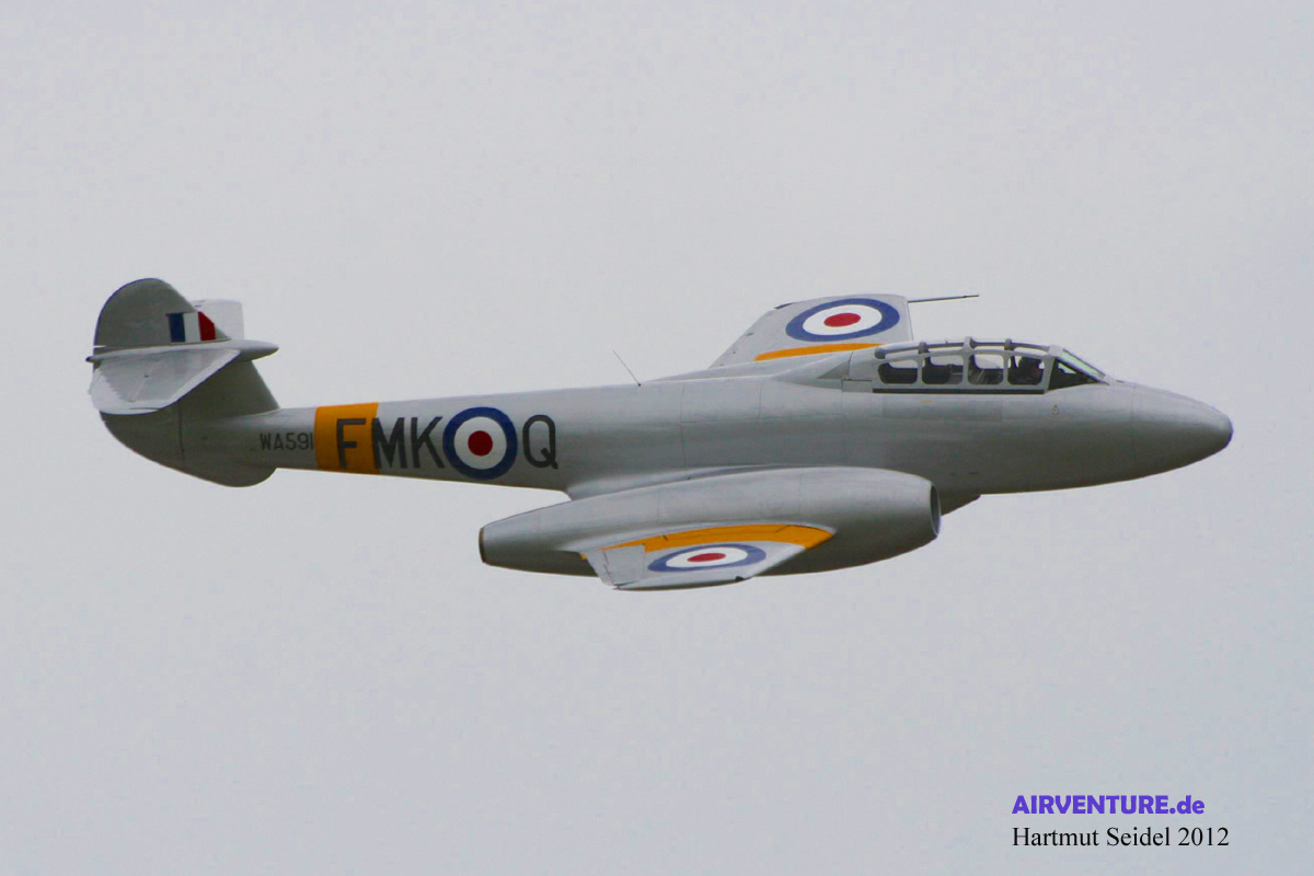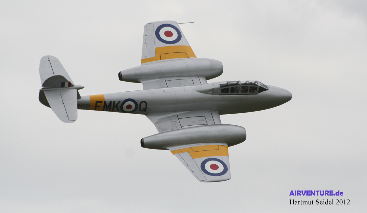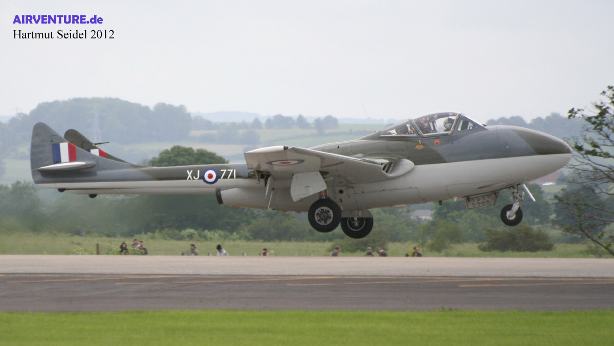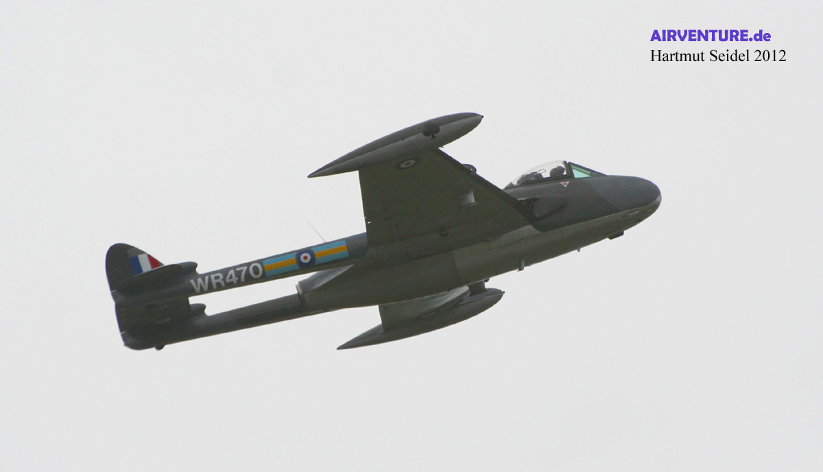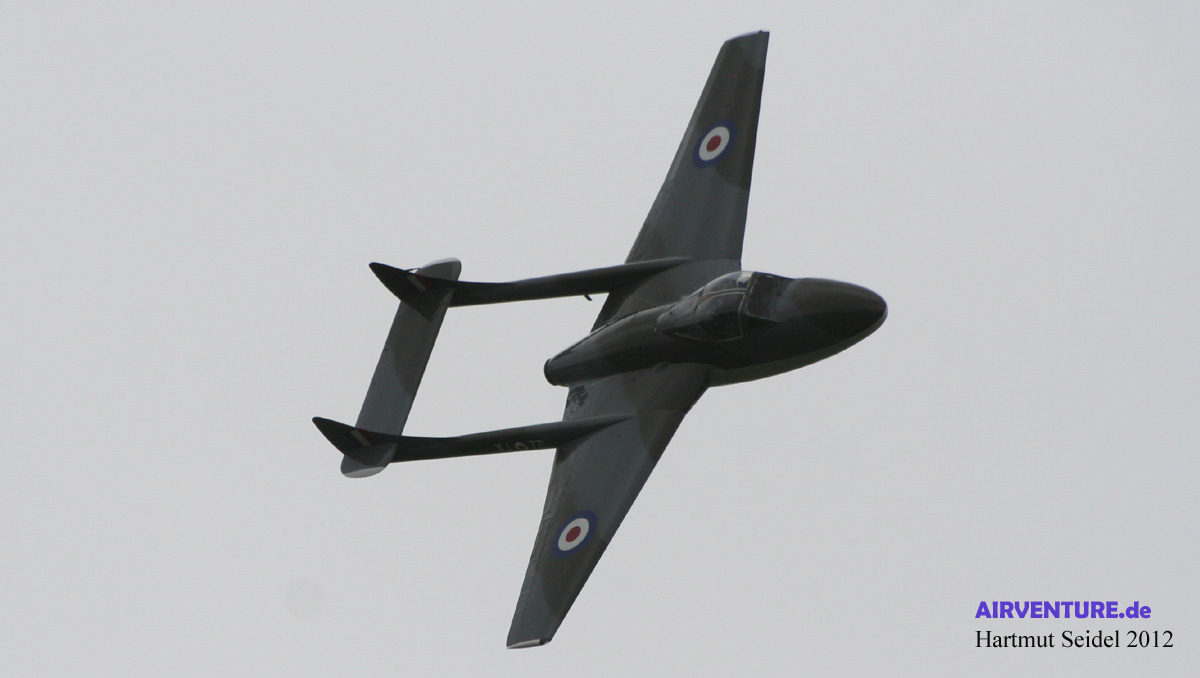 Die während des Yeovilton International Air Day 2012 im Flug gezeigte De Havilland Venom ist eine von insgesamt zwei Venoms des ( damals noch ) Classic Aircraft Trust. Beide Maschinen wurden in der Schweiz in Lizenz gebaut, wo Maschinen dieses Typs bis 1983 von der Schweizer Luftwaffe eingesetzt worden sind. |