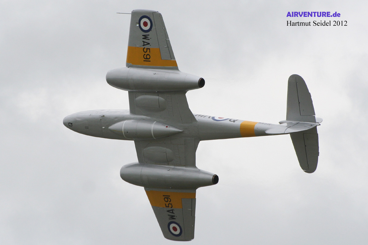 Die dritte Maschine aus der Classic Aircraft Trust / Classic Air Force Flotte im Flying Display des Yeovilton International Air Day 2012 war diese von John Dodd geflogene De Havilland Vampire. |